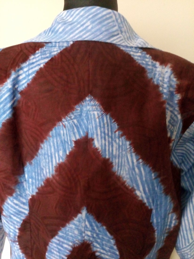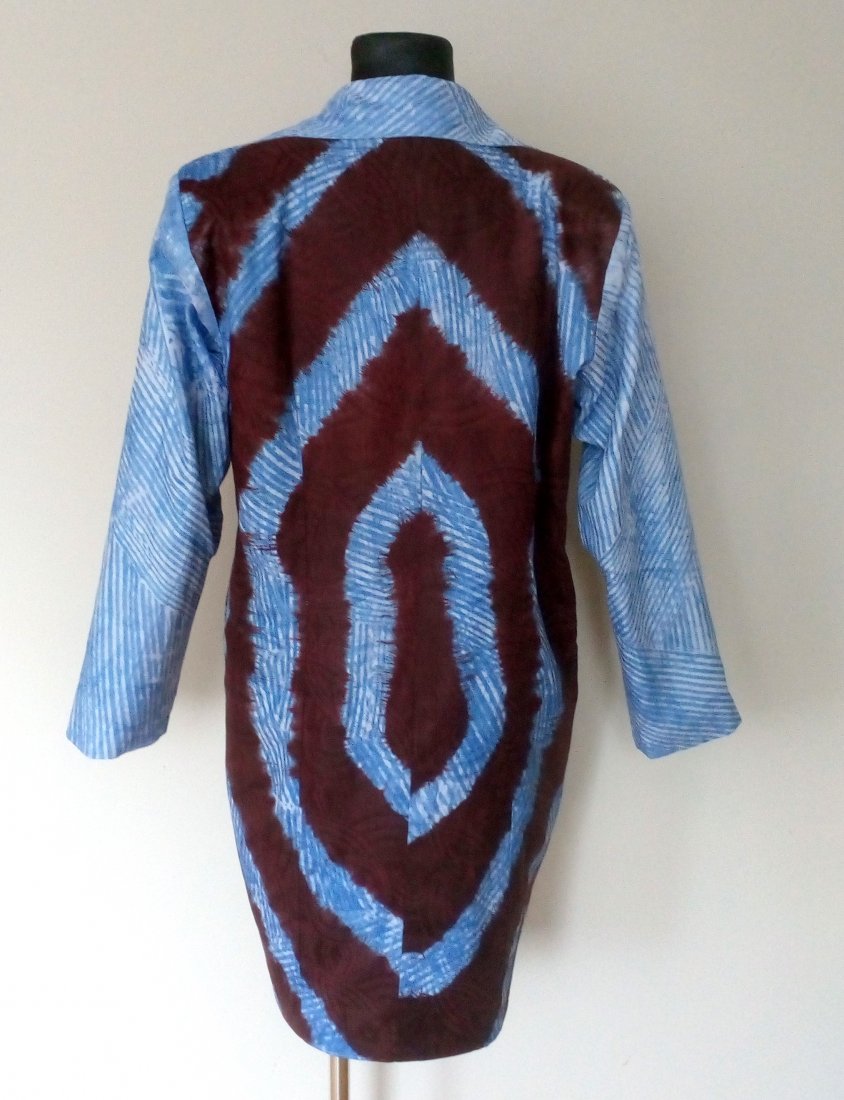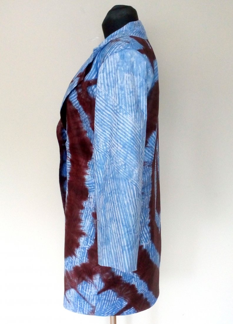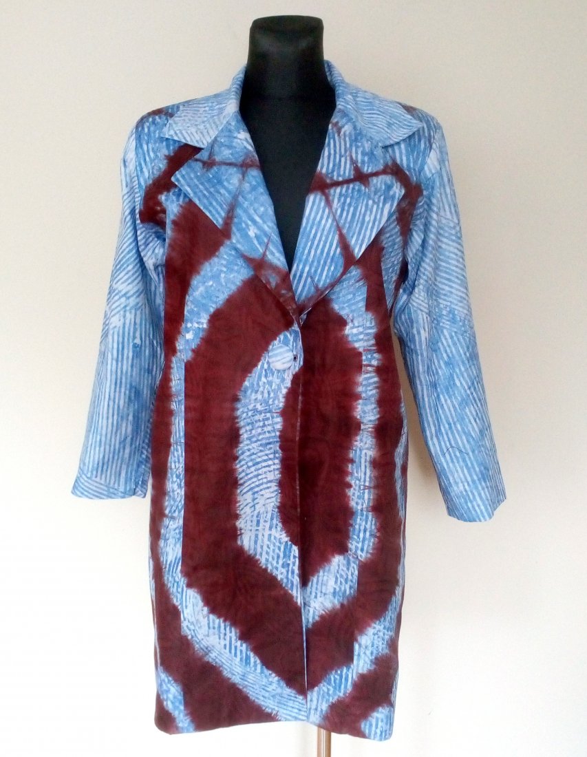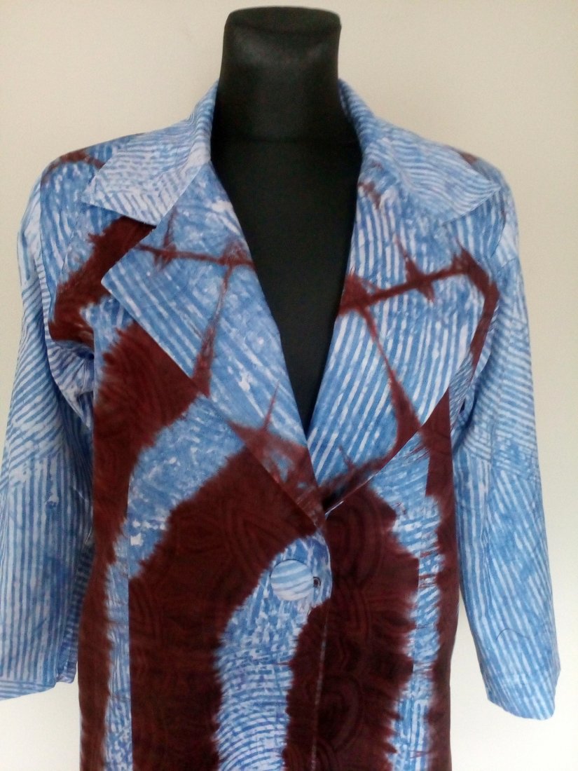 Ciekawy płaszcz zapinany na jeden guzik obciągany materiałem, kołnierz z rewersem, na ramionach poduszki, kolorystyka - niebieski, biały, kasztanowy brąz, od środka podszewka w stalowym kolorze i jedna wewnętrzna kieszeń