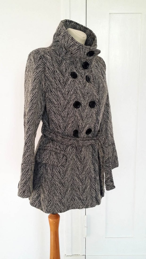 Piękny krótki płaszczyk (kurtka) w jodełkę zapinany na guziki z kieszeniami. Szczegóły widoczne na zdjęciach, które nie oddają jego uroku. Rozmiar 38.