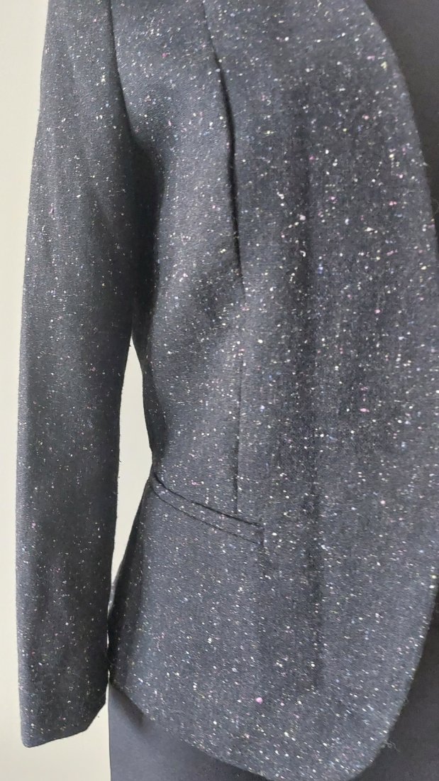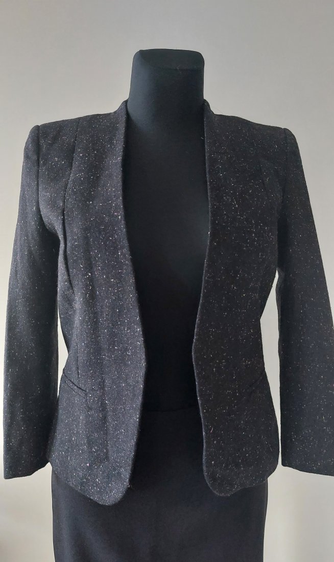 Żakiet w bardzo dobrym stanie, w składzie wełna, wewnątrz podszewka z wiskozy, brak zapięcia, rozmiar S, długość 51 cm,