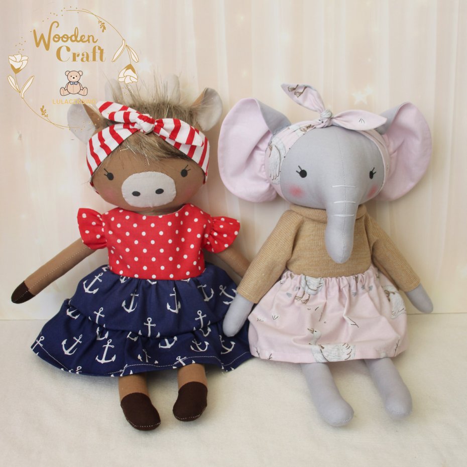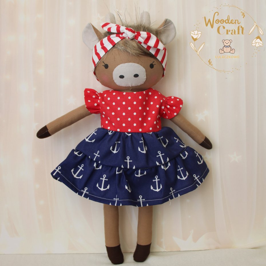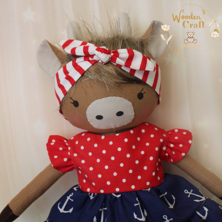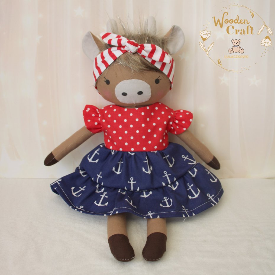 Przeurocza przytulanka krówka, w kolorze ciemnego beżu, uszyta ręcznie z najwyższą starannością, ubrana w uroczą sukieneczkę z falbankami w kolorze czerwono-granatowym z motywem morskim, z czerwono-białą opaską na głowie. Wykonana ze 100% bawełny, wypełniona antyalergiczną kulką silikonową. Grzywka uszyta z futerka, oczka i nosek malowane wodoodpornym markerem. Górne i dolne łapki układają się luźno, krówka siedzi z podparciem. Sukieneczkę można swobodnie zdejmować, jest zapinana na rzep.