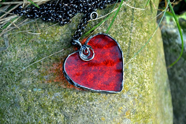 Przedstawiam romantyczny wisior ze szkłem w pięknym kolorze. Wymiary serca to ok. 5 cm x 5 cm. Szkło oprawione w ekologiczną cynę stylizowaną na stare srebro zawieszone na długim łańcuchu. Biżuteria w 100% wykonana ręcznie, poszczególne sztuki mogą się minimalnie między sobą różnić.