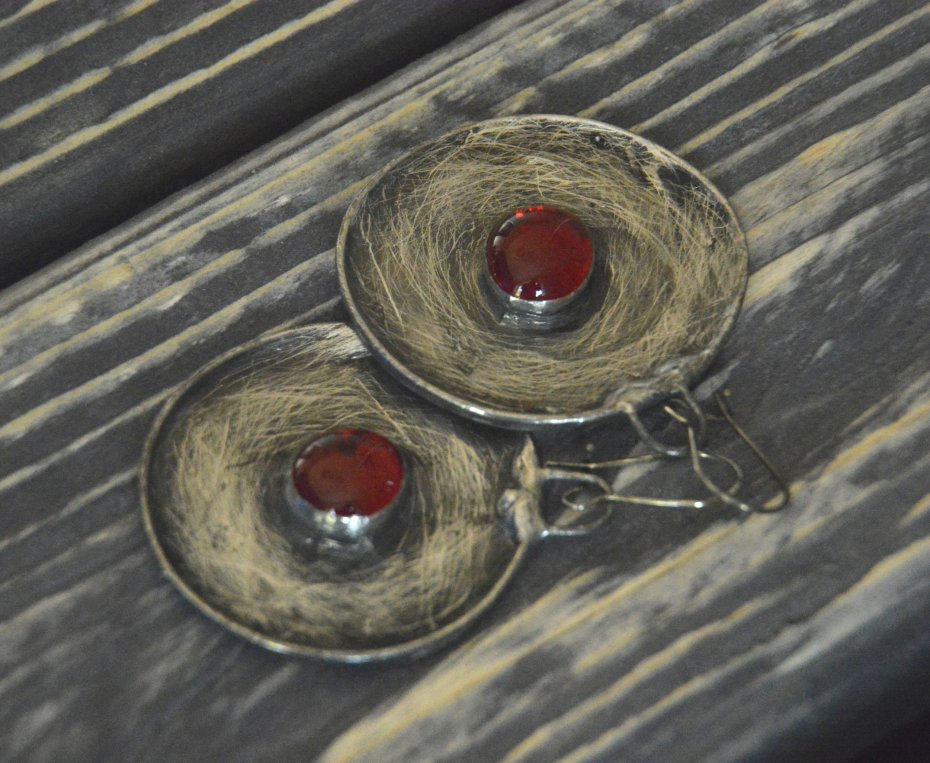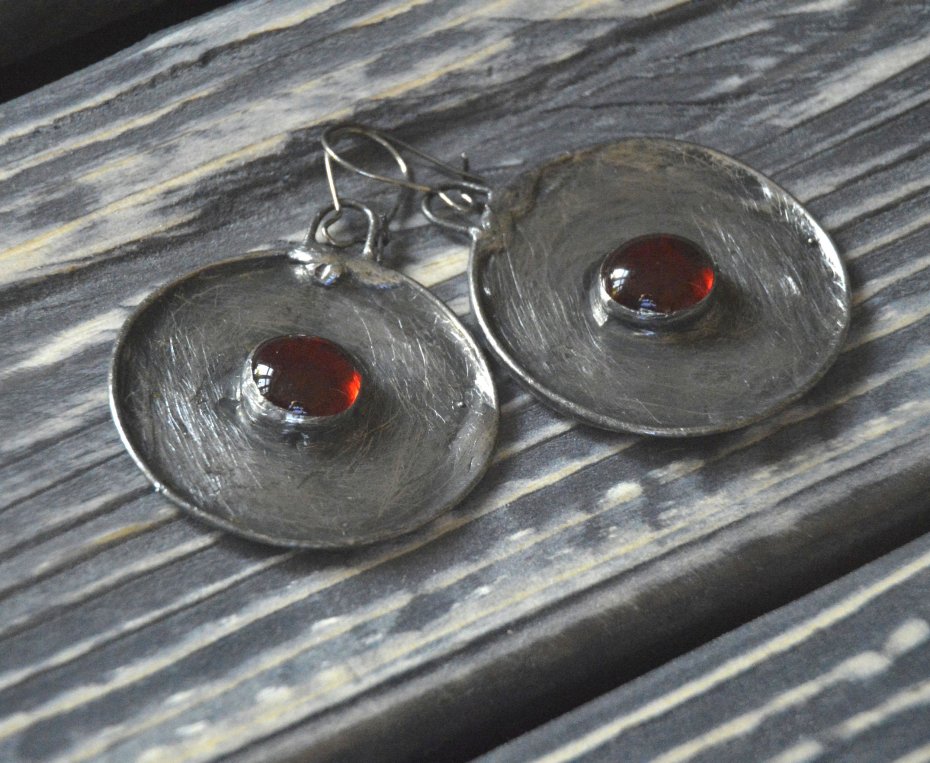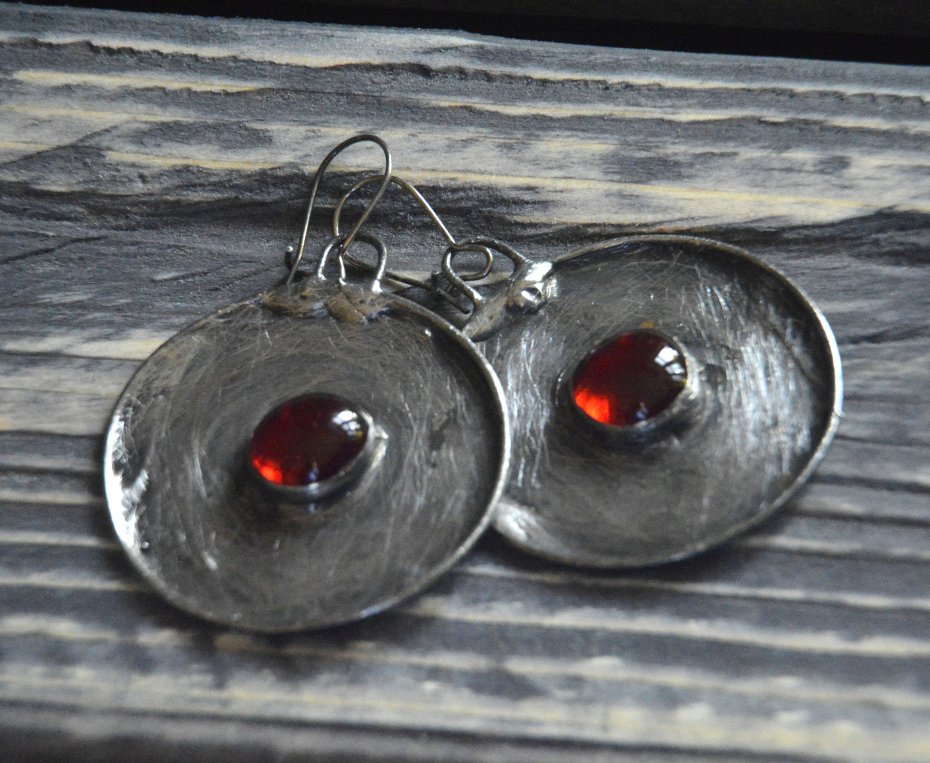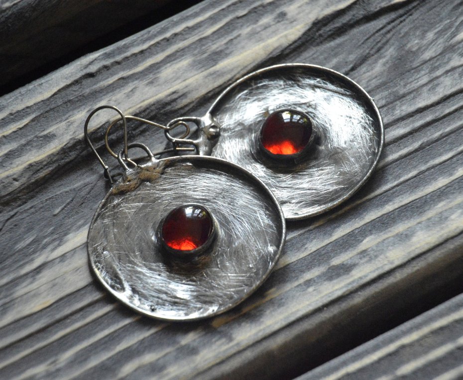 Kolczyki tarcze wykonane ręcznie z miedzi lutowane przy użyciu stopu cyny i srebra ozdabiane szklanymi czerwonymi kaboszonami. Koła stylizowane na stare srebro i ręcznie polerowane. Średnica kół wynosi 3,8 cm - zawieszone na zamykanych biglach. Zapraszam do zakupu..