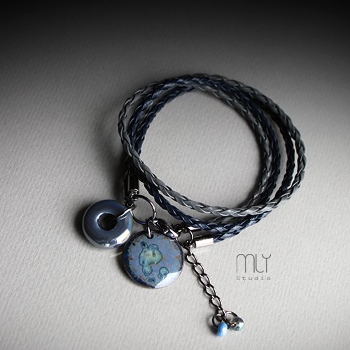 Efektowna bransoletka wykonana z rzemienia jubilerskiego w kolorze brązowym, elementów w kolorze ciemnego srebra i ręcznie wykonanej ceramicznej zawieszki, szkliwionej mieszanką szarobłękitnych szkliw z efektem plamek o subtelnym połysku, Obwód regulowany. Polecam