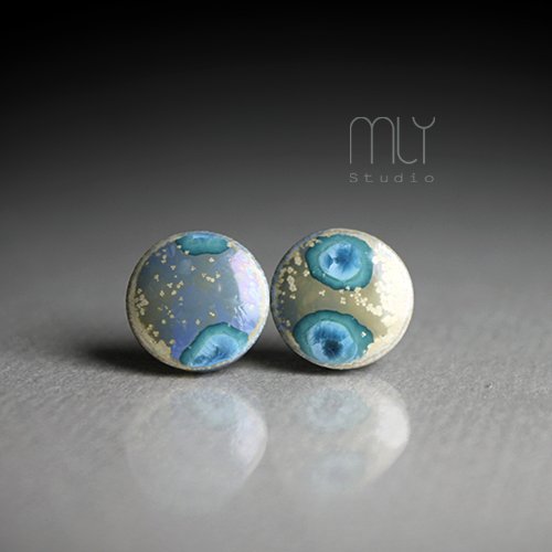 Ceramiczne, lekko nieregularne kolczyki w formie sztyftów, ręcznie wykonane z delikatnej gliny kamionkowej, jednostronnie szkliwione efektownym szarobłękitnym szkliwem z efektem plamek i kryształów, na antyalergicznych sztyftach w kolorze srebrnym.Średnica ok. 11mm. Polecam
