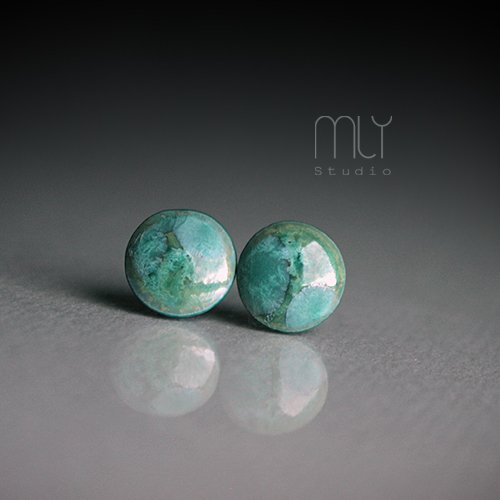 Ceramiczne okrągłe kolczyki w formie sztyftów, ręcznie wykonane z delikatnej zielonej porcelany, jednostronnie szkliwione mieszanką zielonych szkliw z efektem plamek, na antyalergicznych sztyftach w kolorze srebrnym. Średnica ok 9mm. Polecam