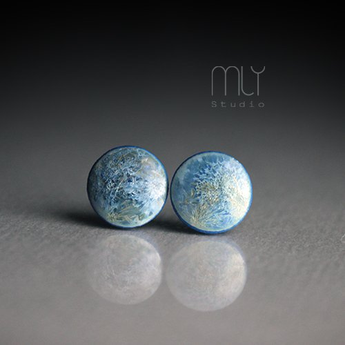 Ceramiczne kolczyki w formie sztyftów, ręcznie wykonane z delikatnej porcelany, barwionej na ciemny błękit jednostronnie szkliwione błękitnym szkliwem z efektem plamek, na antyalergicznych sztyftach w kolorze srebrnym.Średnica ok. 9mm.Polecam