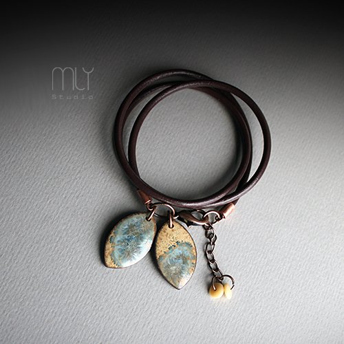 Efektowna bransoletka wykonana z rzemienia jubilerskiego w kolorze brązowym, elementów w kolorze miedzianym i ręcznie wykonanych ceramicznych zawieszek, szkliwionych mieszanką szarobeżowych szkliw z efektem plamek o subtelnym połysku, Obwód regulowany. Polecam