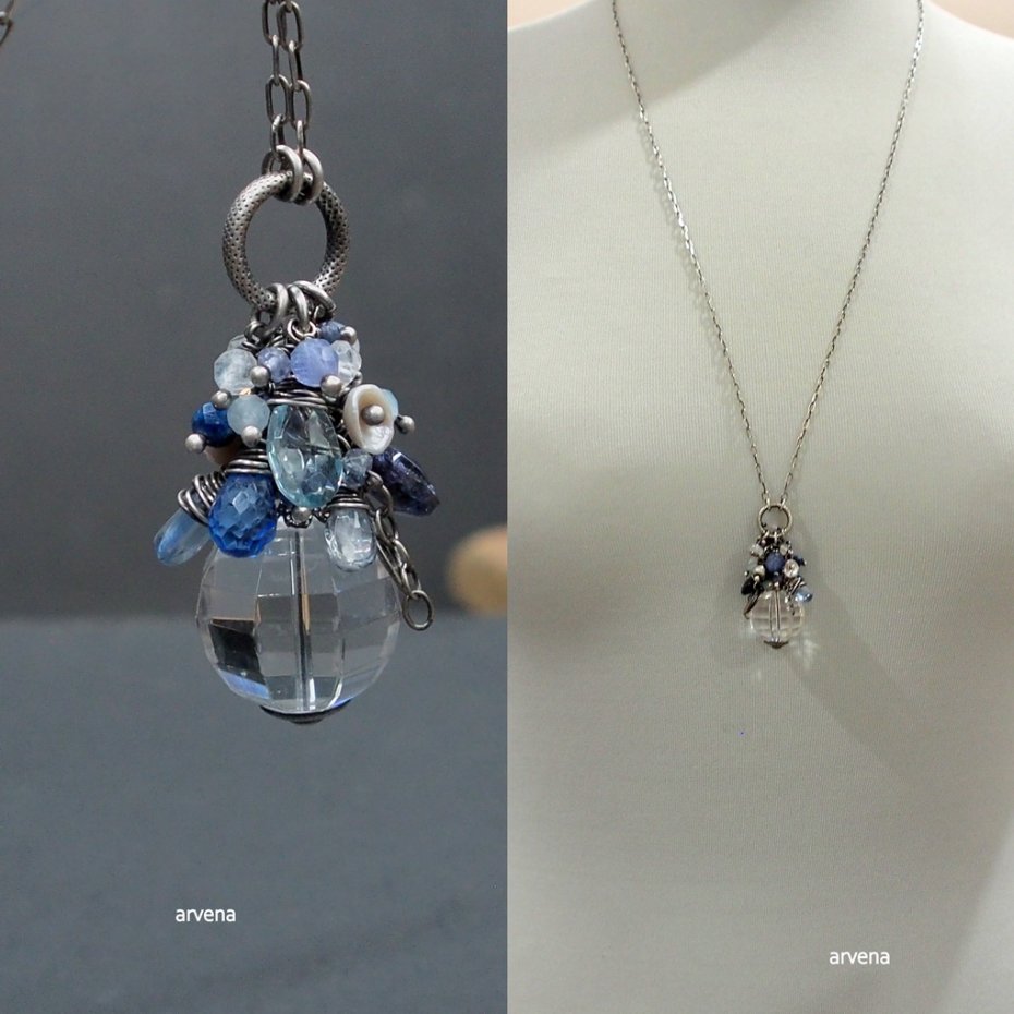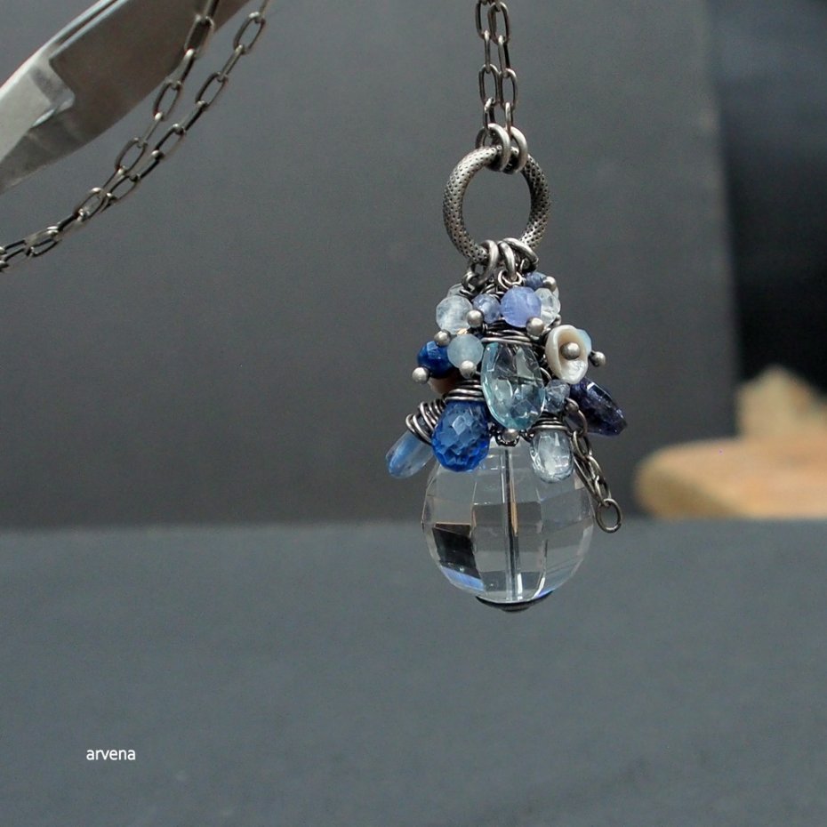 Minerałowy koktajl w tonacji niebieskiej dopełniony dużym, fasetowanym kryształem górskim na długim łańcuszku...