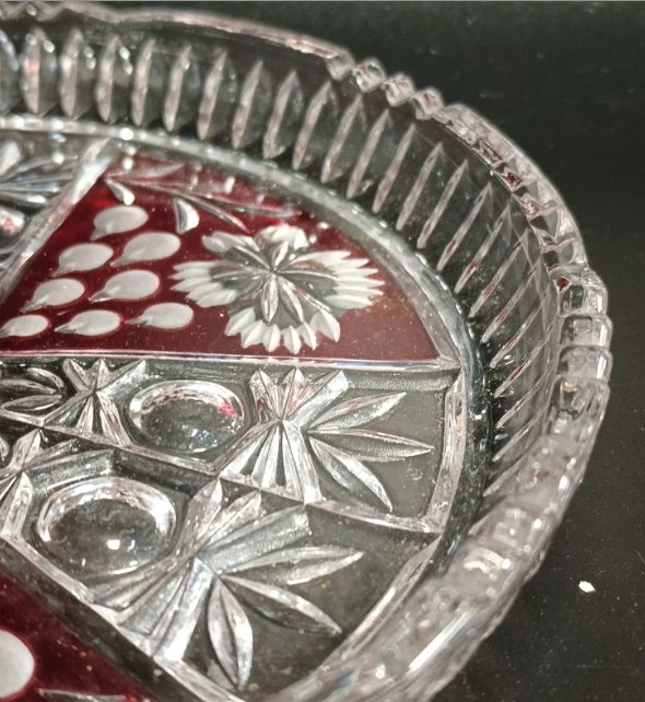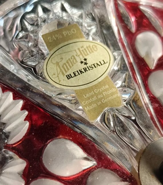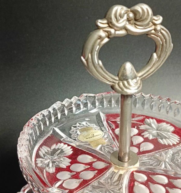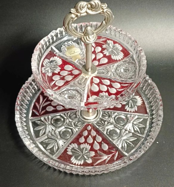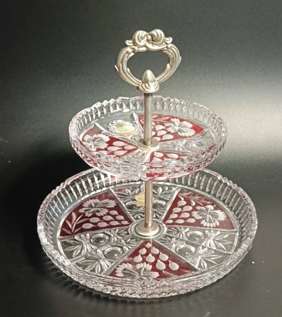Śliczna, dwupiętrowa paterka wykonana ze szkła kryształowego w dwóch kolorach. Naklejki producenta - Anna Hütte.
