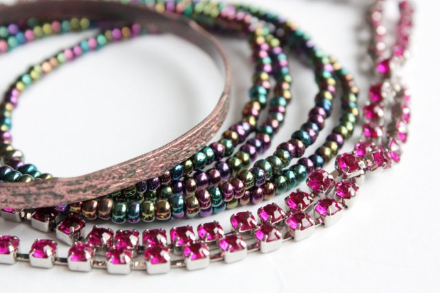 Fuksjowe długie koraliki, które można nosić jkao naszyjnik lub bransoletkę. Uwaga: brakuje jednego kryształka (jak na zdjęciu).