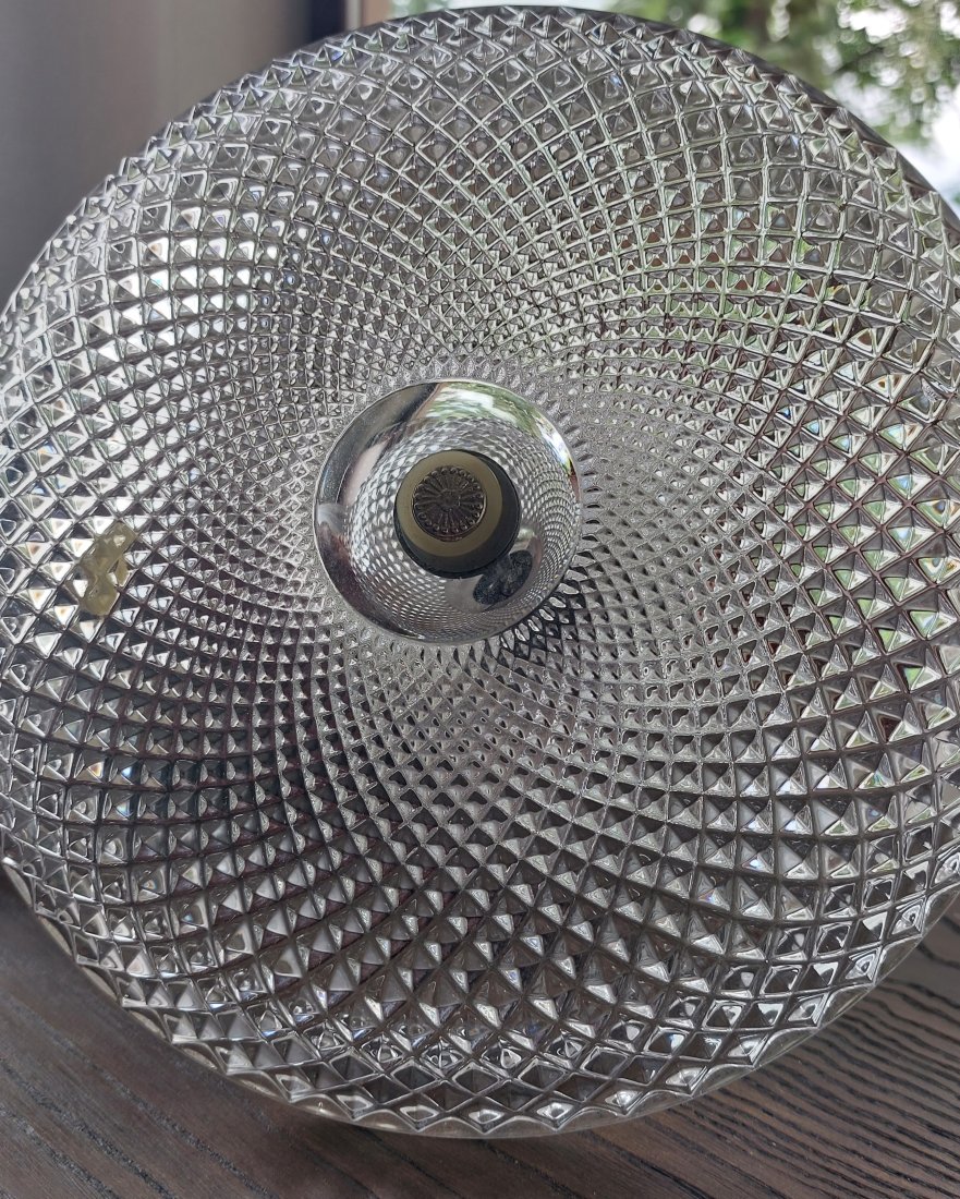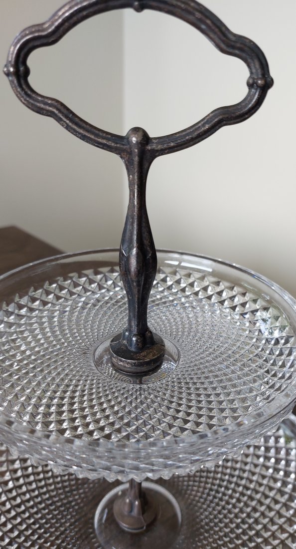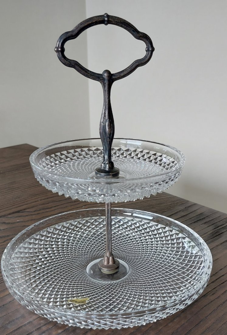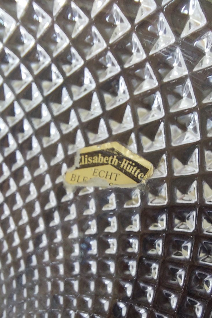 Kryształowa patera dwupoziomowa , Elisabeth Hütte Germany, zachowana część etykiety, stan: brak podstawy, szkło bez zastrzeżeń. Wysokość 27 cm, średnica: 15 cm, 22 cm.