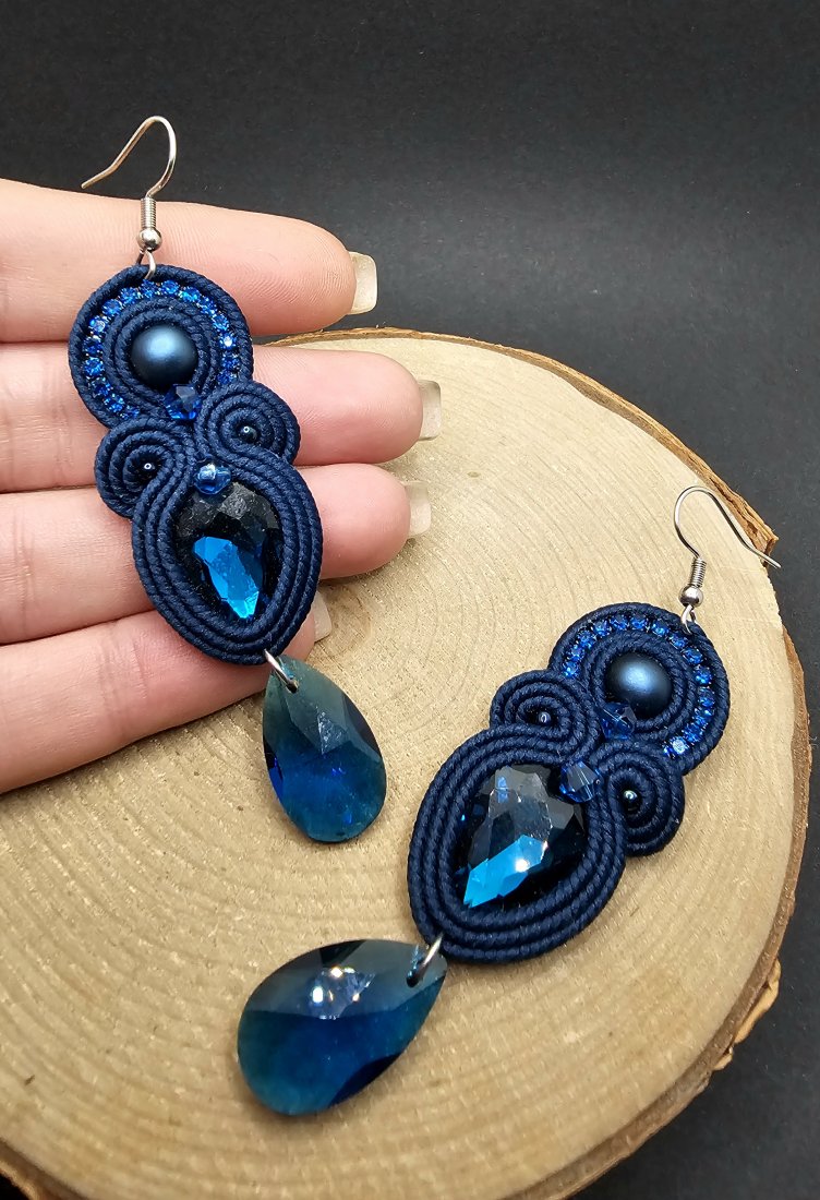 Szklane fasetowane kryształki otoczone polskimi sznurkami sutasz oraz japońskimi koralikami TOHO. Górę kolczyków zdobią matowe perły wraz z taśmą cyrkoniową. Dół kolczyków zakończony wiszącymi kryształkami w kształcie migdała. Kolczyki zawieszone na klasycznych otwartych biglach w kolorze ciemnego srebra ze stali chirurgicznej.