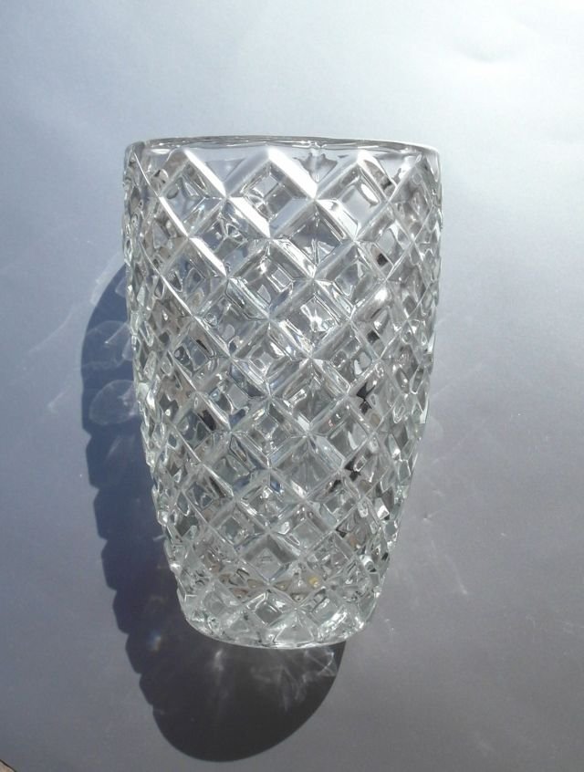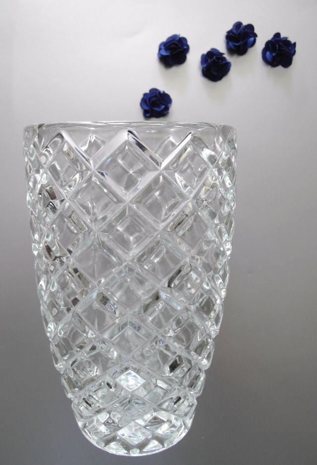 zgrabny, nie za duży wazon kryształowy. szlifowany w romby, pięknie blikuje światłem.