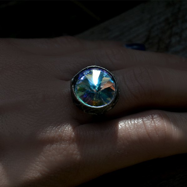 Bardzo efektowny pierścionek z przepięknie odbijającym światło fasetowanym kryształkiem. Średnica szkła wraz ze stylizowaną na stare srebro oprawą to ok. 1,7 cm. Obrączka regulowana. Biżuteria w 100% wykonana ręcznie, poszczególne sztuki mogą się minimalnie różnić.