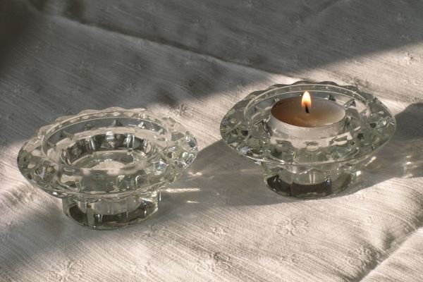Dwa szlachetnie grubo-szklane świeczniki o kryształowej jasności i promienistości. Bardzo praktyczne, bo z wgłębieniami zarówno na tea-lighty, jak i zwykłe świece stołowe :) Na miękko rytem formowane. Dół 4,5; góra 9,5; wys. 4,5 cm. Stan zachowania bardzo dobry.