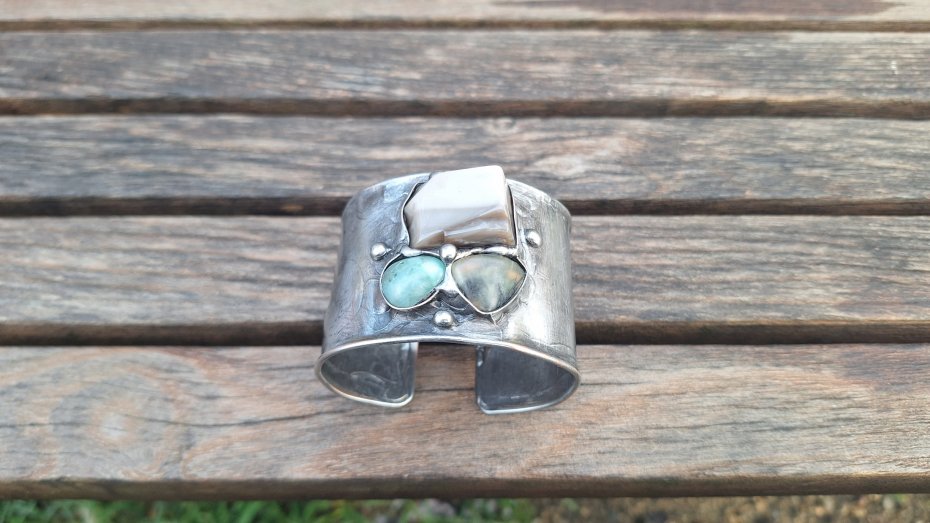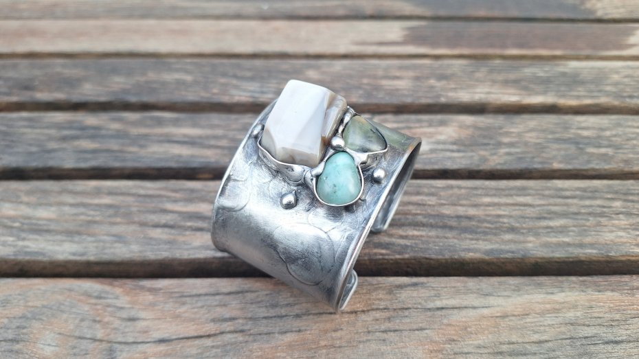 Lekka bransoleta wykonana z miedzi, cyny, amazonitu, prenitu i krzemienia pasiastego. Szerokość ok. 4. 5 cm; regulowana.