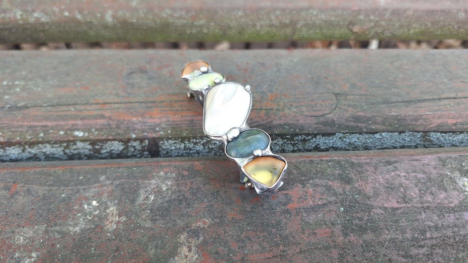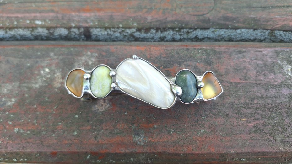 Klamra do włosów, wykonana z miedzi, cyny, szkła, jaspisów i krzemienia pasiastego. Zapięcie metalowe, automatyczne, ok. 6 cm. Wymiary ok. 8 na 2 cm.