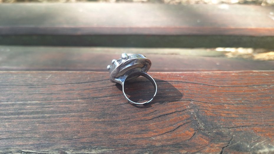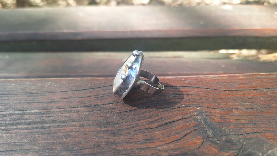 Pierścionek wykonany z miedzi, cyny i krzemienia pasiastego. Wymiary ok. 2.5 na 2.5 cm. Regulowany. Nie jest ciężki.