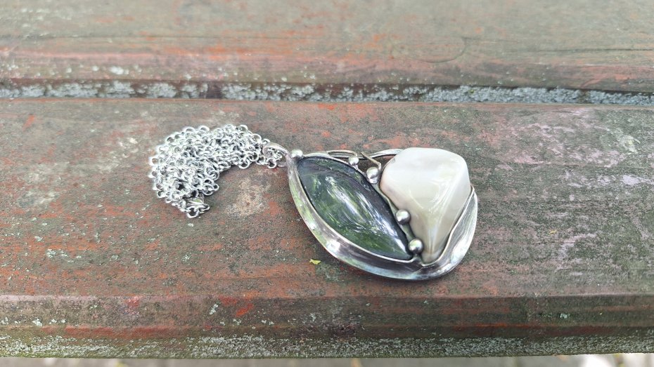 Wisiorek wykonany z miedzi, cyny, labradorytu i krzemienia pasiastego. Wymiary ok. 5 na 4 cm. Zawieszony na łańcuszku o długości ok. 50 cm.