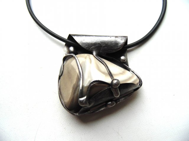 Wisiorek wykonany techniką witrażową z miedzi, cyny i krzemienia pasiastego. Zawieszony na czarnej lince kauczukowej o długości ok. 45 cm. Wymiary ok. 5 na 4,5 cm.