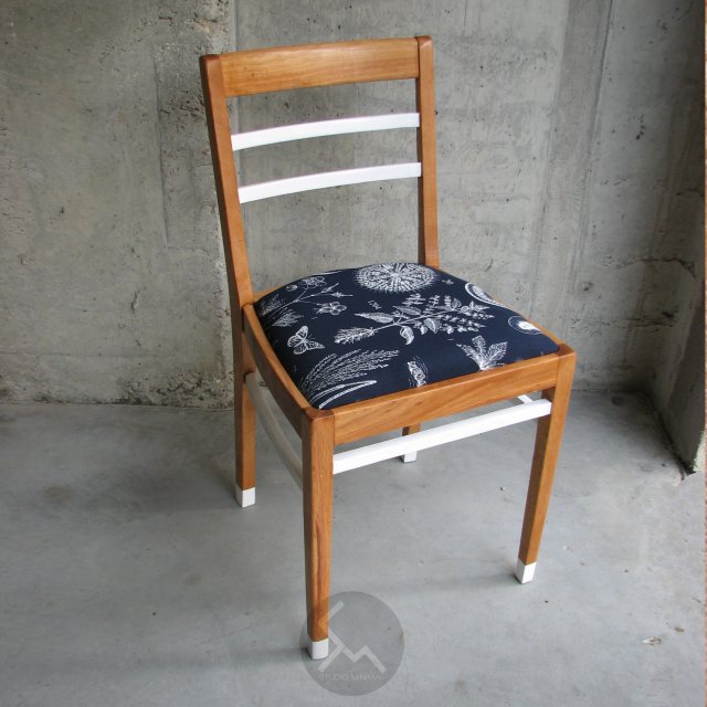 Odrestaurowane poniemieckie krzesło drewniane. Dokładnie oczyszczone i zaimpregnowane. Pokryte naturalną bukową bejcą oraz zabezpieczone twardym lakierem do drewna. Białe elementy pokryte wytrzymałą satynową farbą. Siedzisko wykonane z solidnych pasów parcianych, grubej gąbki tapicerskiej oraz grubego materiału, podbity na biało.