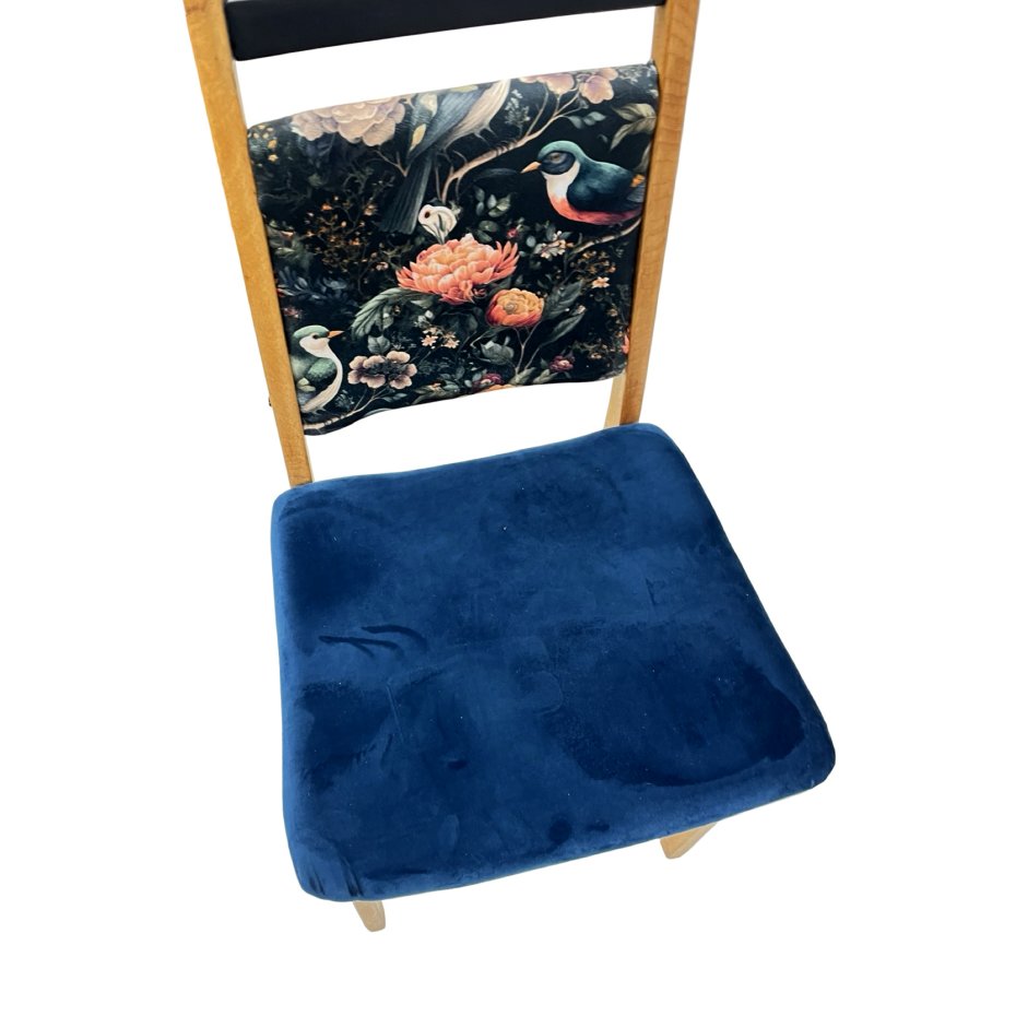 Prezentowany egzemplarz przeszedł profesjonalną renowację. Siedzisko otrzymało nową tapicerkę z wysokiej jakości materiału tapicerskiego w głębokim, granatowym odcieniu. Oparcie wykończono dekoracyjną tkaniną z motywem florystycznym, co nadaje krzesłu indywidualny charakter, przy jednoczesnym zachowaniu oryginalnej formy modelu.