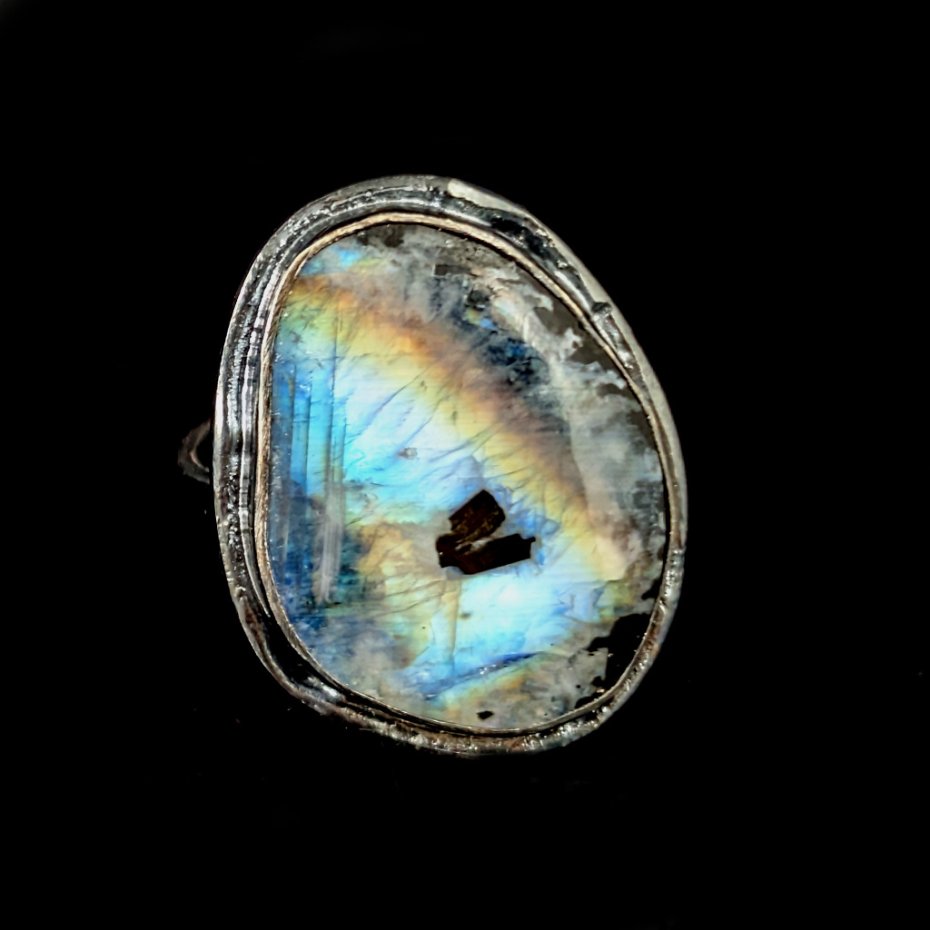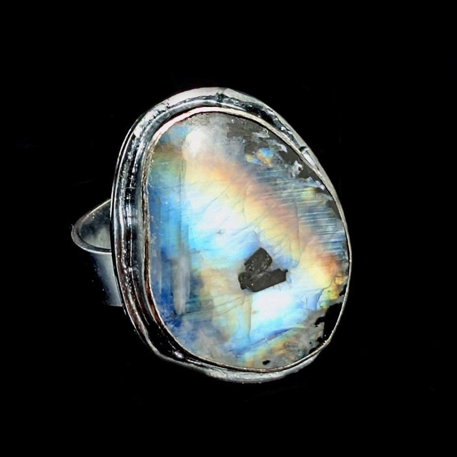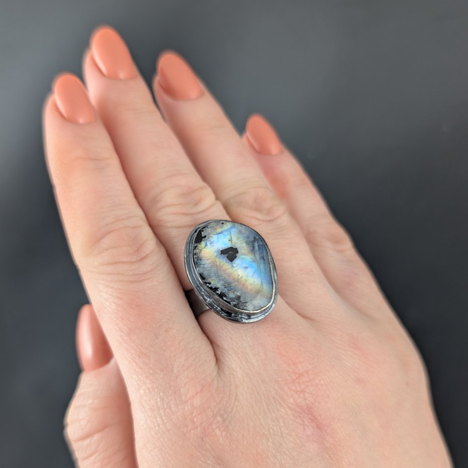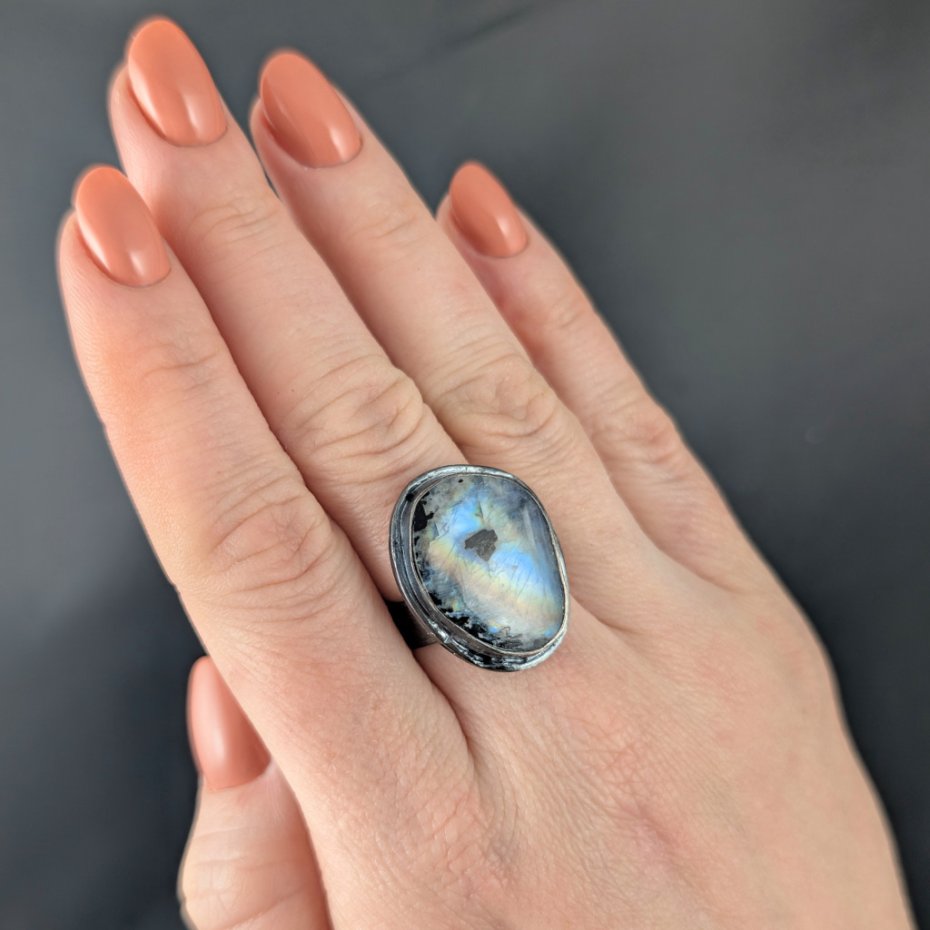 Pierścień wykonany ze srebra próby 925, oksydowane. Rozmiar jubilerski pierścionka regulowany w szerokim zakresie, proszę napisać na jaki dopasować. . Ozdobą pierścionka jest kamień księżycowy o pięknej błękitnej adularyzacji ze złocistym refleksem. Wymiary oprawy kamienia 25 x 20 mm,szerokość obrączki 6 mm. Waga 10,5 grama. Pierścień zostanie zapakowany w ozdobne pudełeczko.