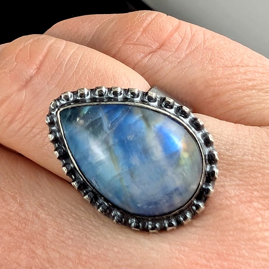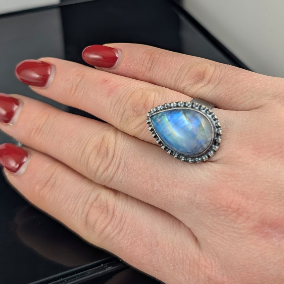 Pierścień wykonany ze srebra próby 925, oksydowane. Rozmiar jubilerski pierścionka 15, mogę powiększyć na max 17. Ozdobą pierścionka jest kamień księżycowy o pięknej błękitnej adularyzacji ze złocistym refleksem. Wymiary oprawy kamienia 24 x 17 mm,szerokość obrączki 5 mm. Waga 10,5 grama. Pierścień zostanie zapakowany w ozdobne pudełeczko.