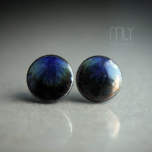 Ceramiczne, lekko nieregularne kolczyki w formie sztyftów, ręcznie wykonane z delikatnej czekoladowobrązowej gliny kamionkowej, jednostronnie szkliwione efektownym błękitnozielonym błyszczącym szkliwem z efektem plamek, na antyalergicznych sztyftach w kolorze srebrnym.Średnica ok. 11mm. Polecam