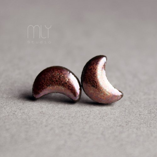 Efektowne kolczyki w formie sztyftów, ręcznie wykonane z delikatnej czekoladowobrązowej gliny kamionkowej, jednostronnie szkliwione czerwonozłotym metalicznym szkliwem, na antyalergicznych sztyftach w kolorze srebra.długość elementu ceramicznego ok. 11mm, Polecam