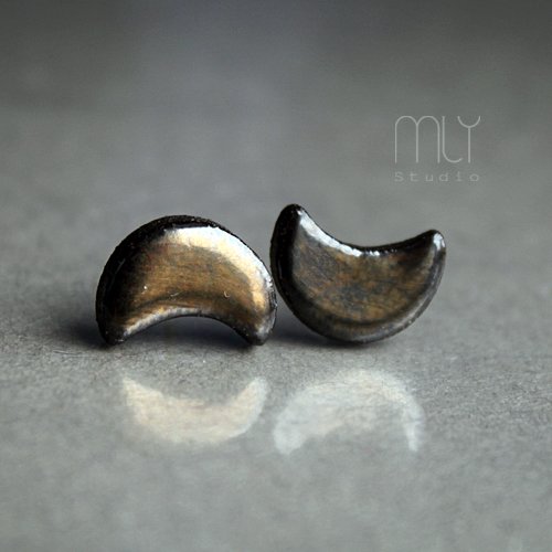 Efektowne kolczyki w formie sztyftów, ręcznie wykonane z delikatnej czekoladowobrązowej gliny kamionkowej, jednostronnie szkliwione stalowoszarym metalicznym szkliwem, na antyalergicznych sztyftach w kolorze srebra.długość elementu ceramicznego ok. 11mm, Polecam
