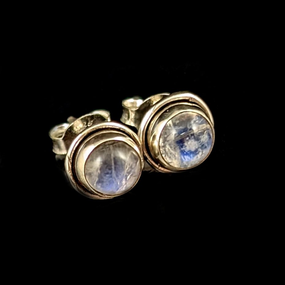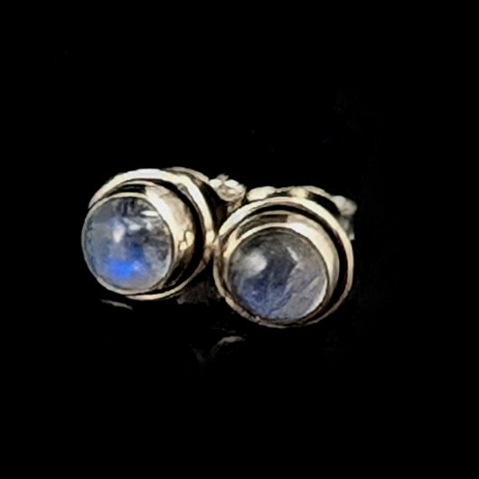 Kolczyki własnoręcznie wykonane ze srebra próby 925 oraz pięknych kamieni księżycowych. Średnica elementów z kamieniami 6 mm. Waga jednego kolczyka 0,4 grama. Kolczyki zostaną zapakowane w ozdobne pudełeczko.
