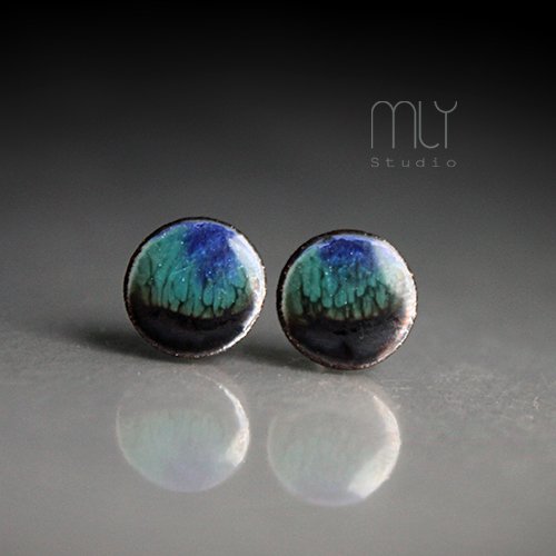 Ceramiczne, lekko nieregularne kolczyki w formie sztyftów, ręcznie wykonane z delikatnej czekoladowobrązowej gliny kamionkowej, jednostronnie szkliwione efektownym błękitnozielonym błyszczącym szkliwem z efektem plamek, na antyalergicznych sztyftach w kolorze srebrnym.Średnica ok. 9mm. Polecam