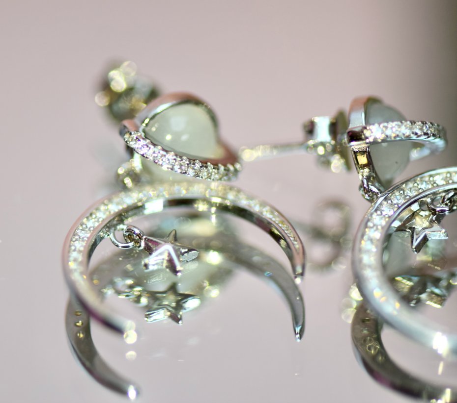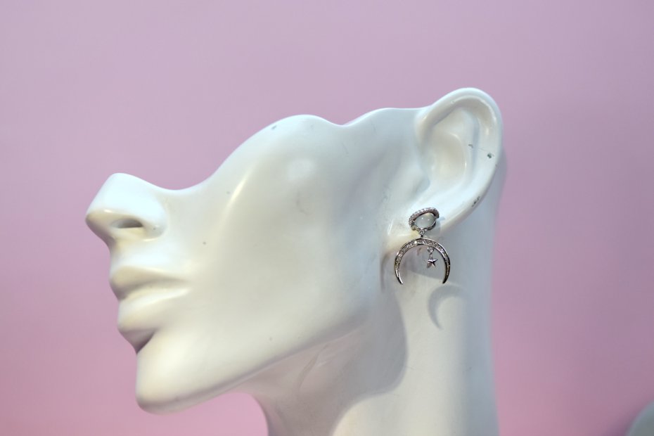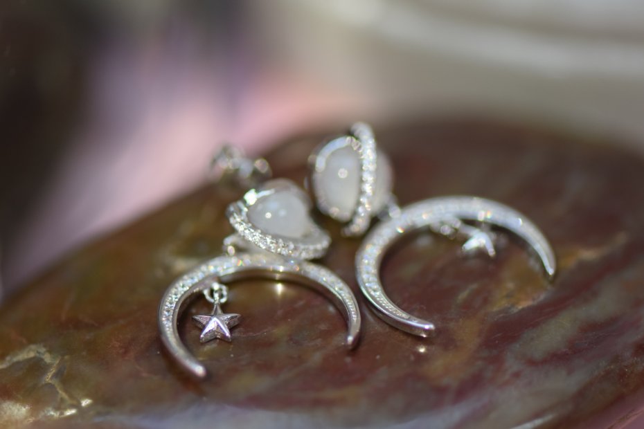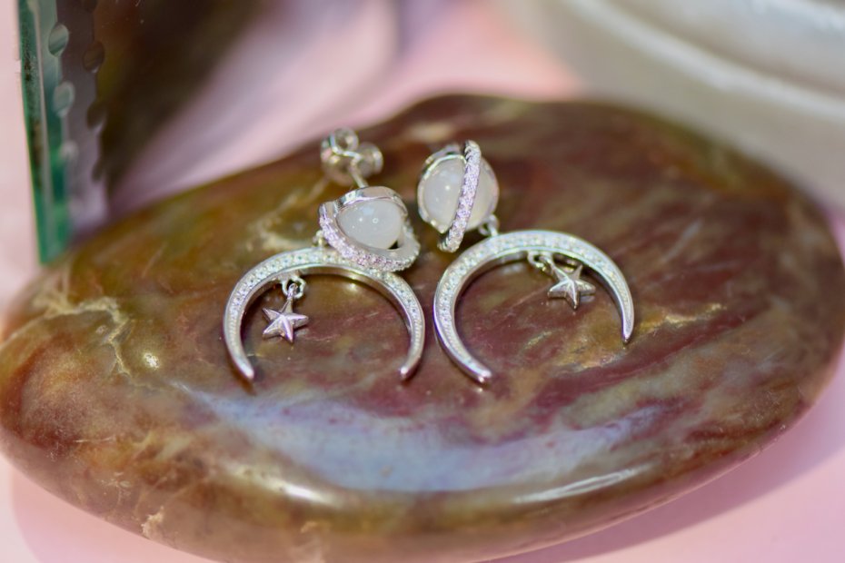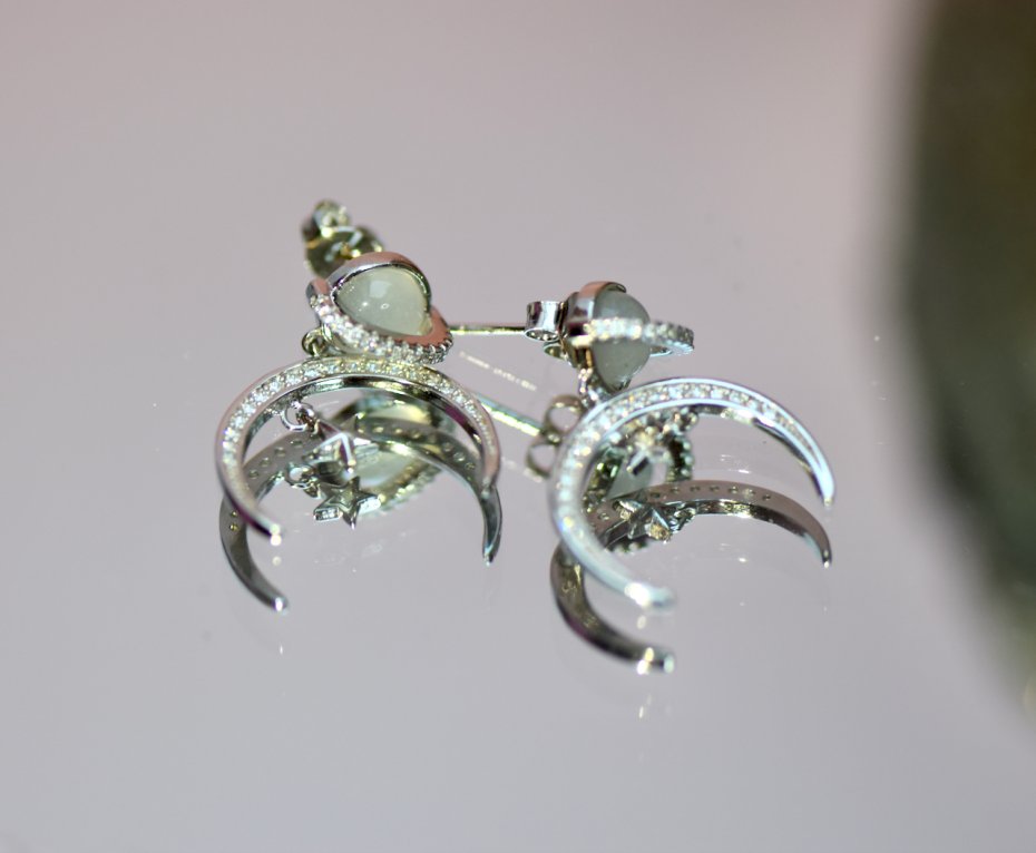 Piękne kolczyki z księżycowym kamieniem, lunulą i gwiazdką z nieba.
