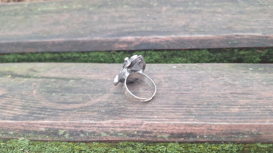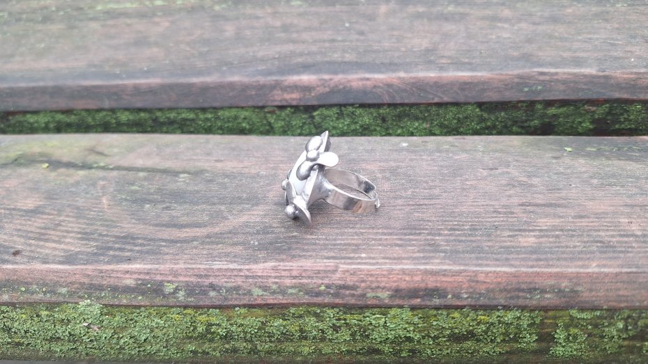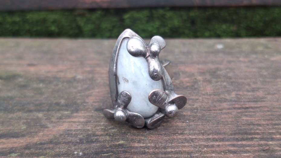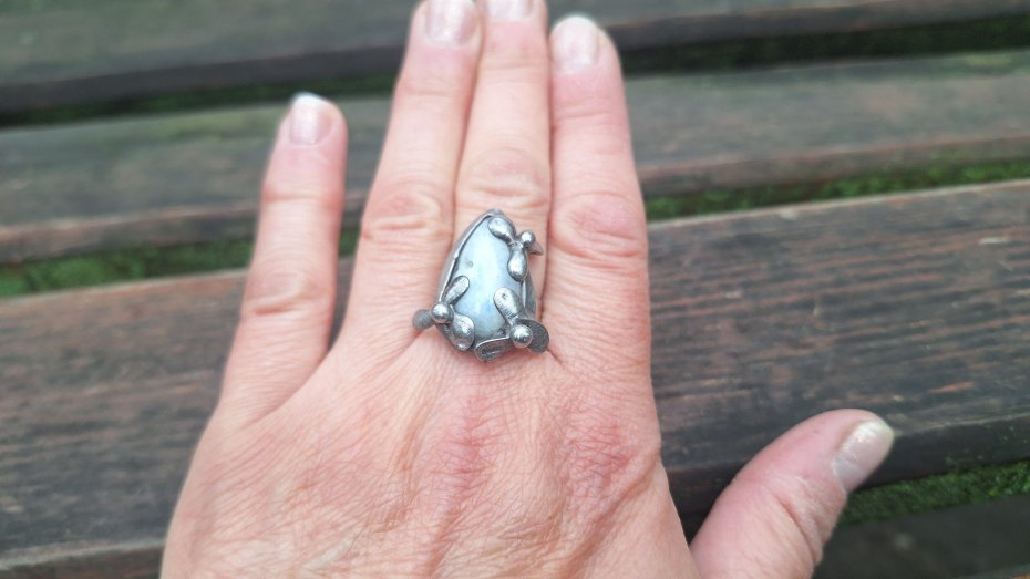 Pierścionek wykonany z miedzi, cyny i naturalnego kamienia księżycowego. Wymiary ok. 2.5 na 1.5 cm. Regulowany. Nie jest ciężki.