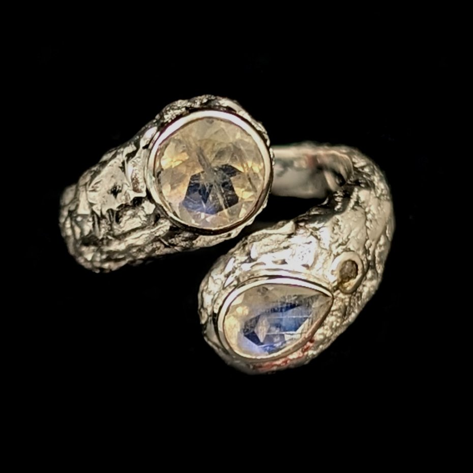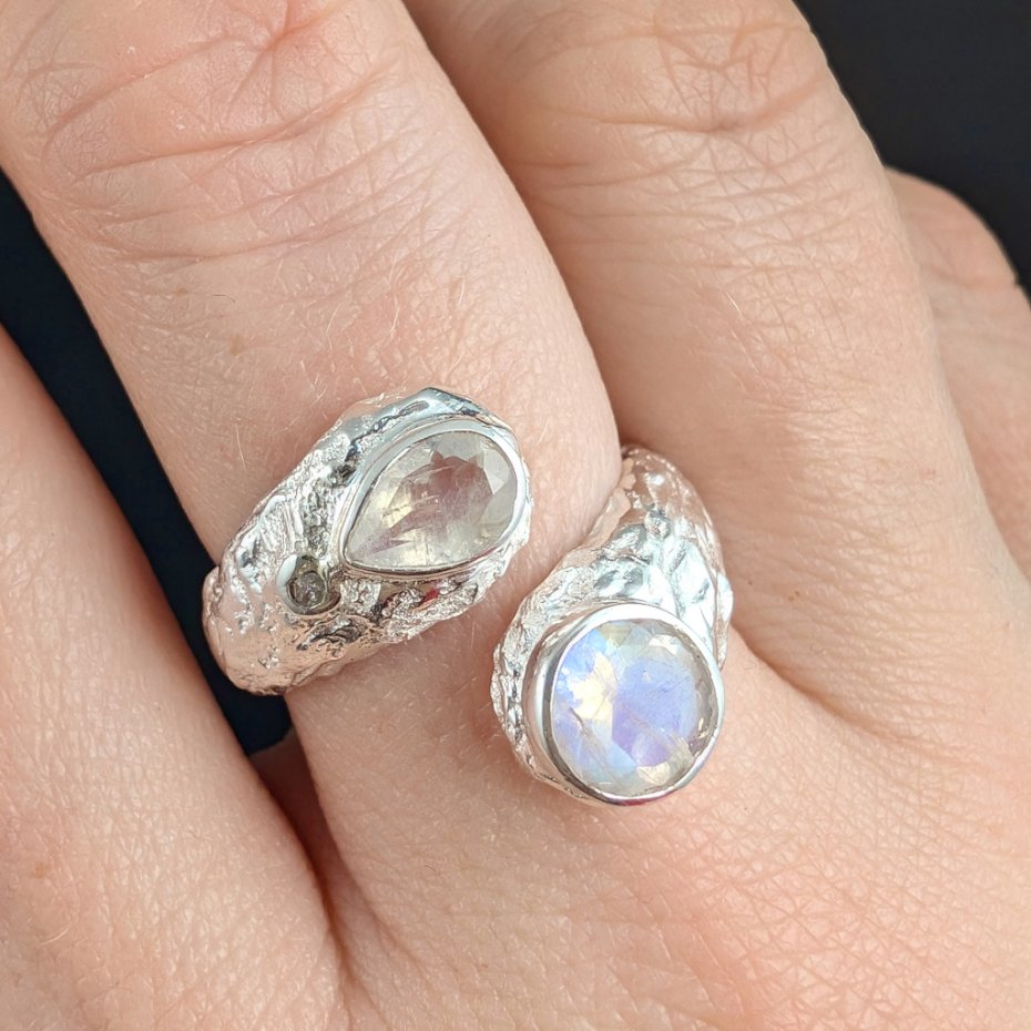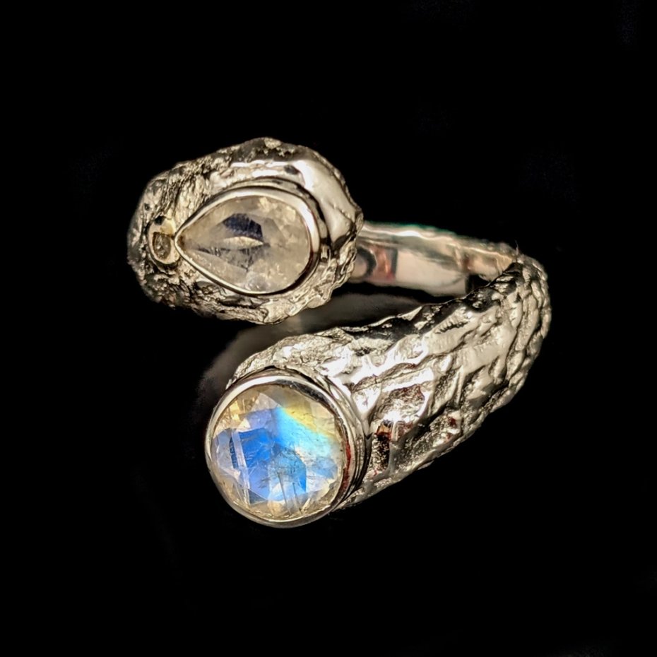 Pierścień wykonany ze srebra pr. 925 oraz przepięknych kamieni księżycowych w oprawie 7,5 x 5 mm oraz okrągły 7 mm. Łezka ma obok wkomponowany maleńki surowy diament. Przeuroczy. Rozmiar jubilerski min 15, max 19. Ustawię odpowiedni, proszę o wiadomość. Waga 8,5 g. Wykonany przez dostawcę kamieni. Pierścień zostanie zapakowany w ozdobne pudełeczko.