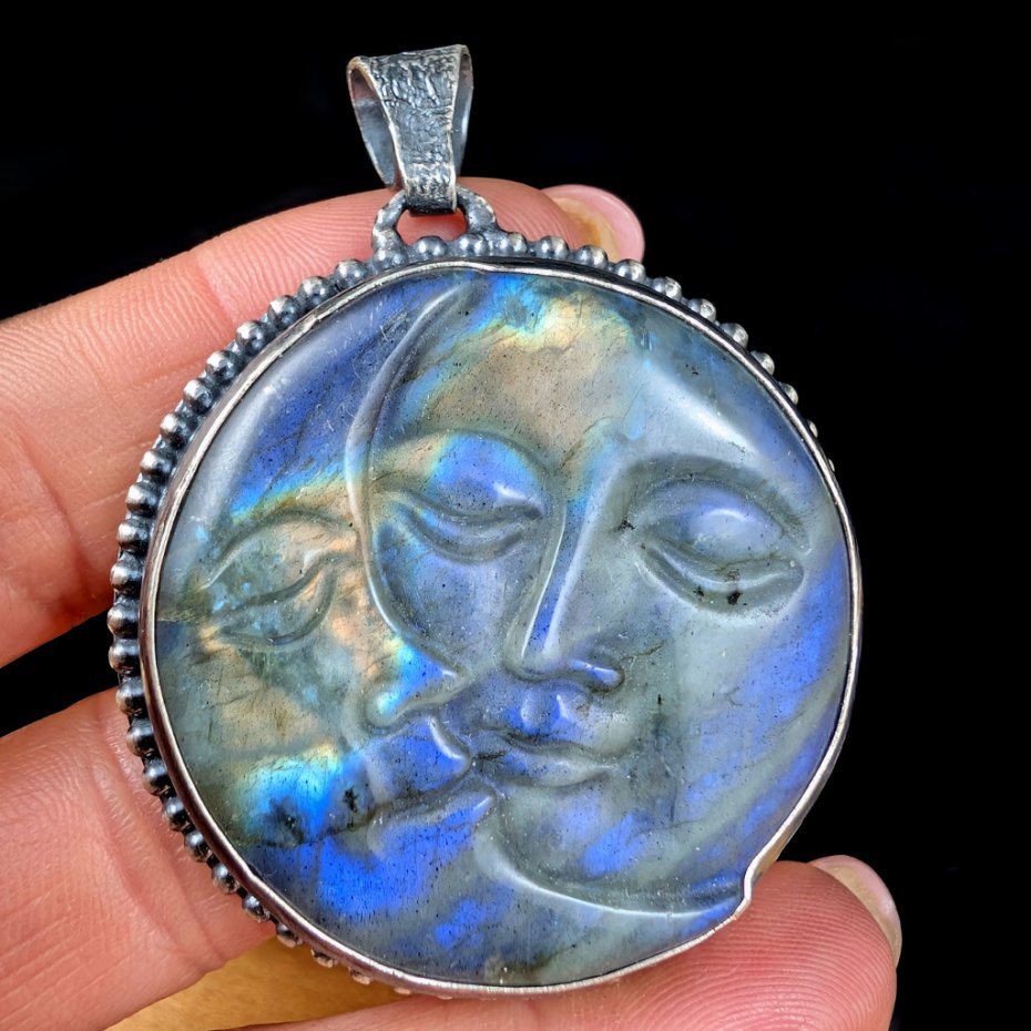 z oprawionym rzeźbionym w labradorycie przepięknym wizerunkiem twarzy i księżyca.