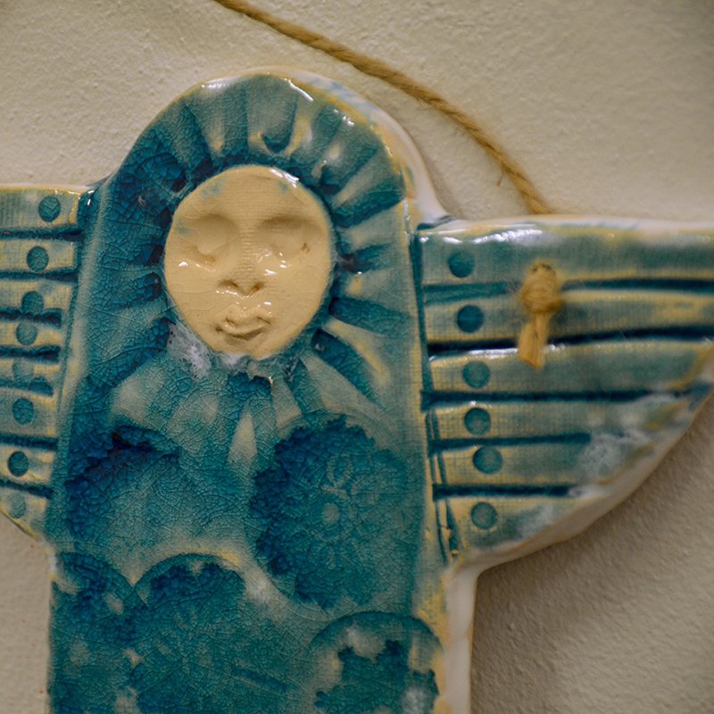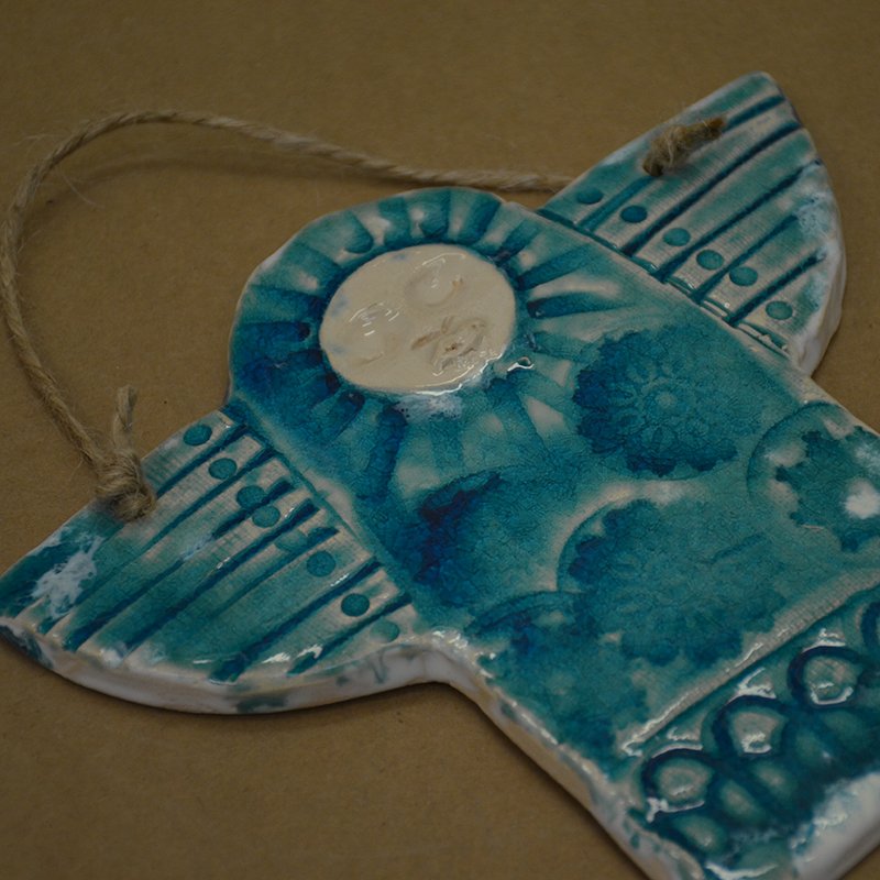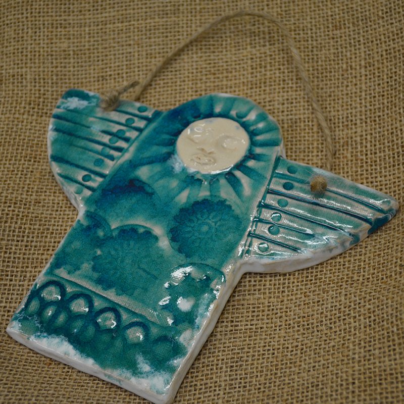 Ceramiczny Anioł wiszący. Ręcznie lepiony z białej gliny. Wypalony i szkliwiony w piecu. Szkliwiony przeźroczystym , turkusowym i białym szkliwem. Wymiary anioła ok 16x19cm