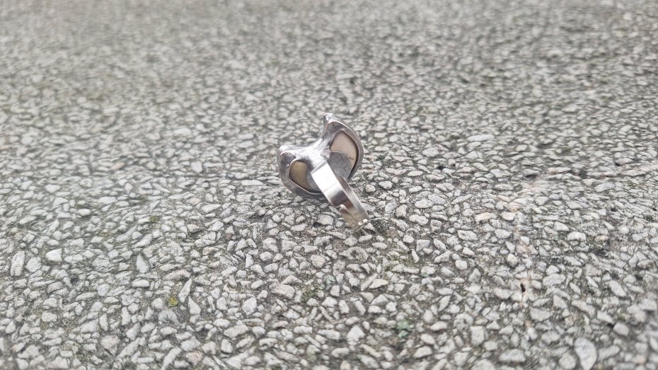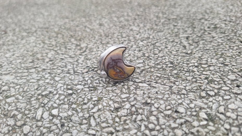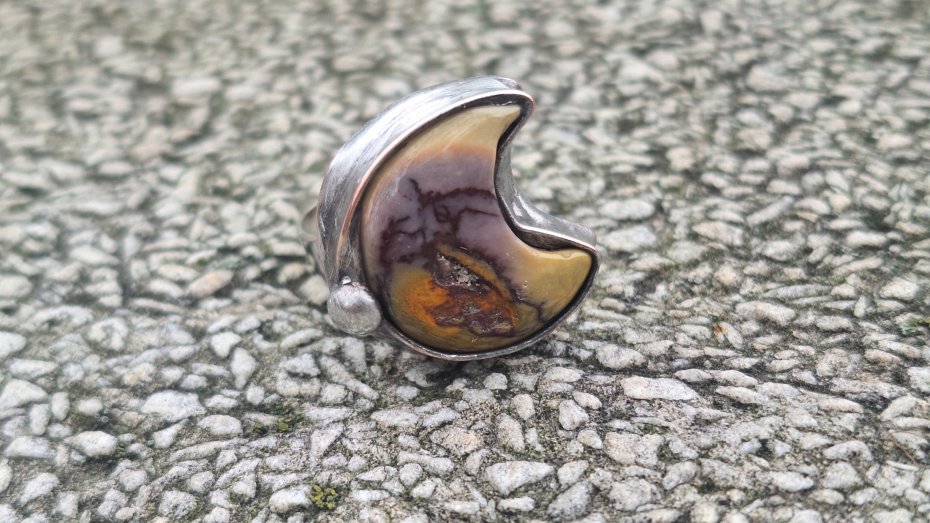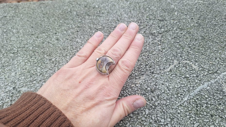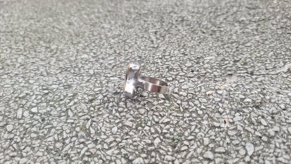 Pierścionek wykonany z miedzi, cyny i jaspisu mokaitu. Wymiary ok. 2 na 2 cm. Regulowany. Nie jest ciężki. Kamień posiada miejscami naturalne niedoskonałości.