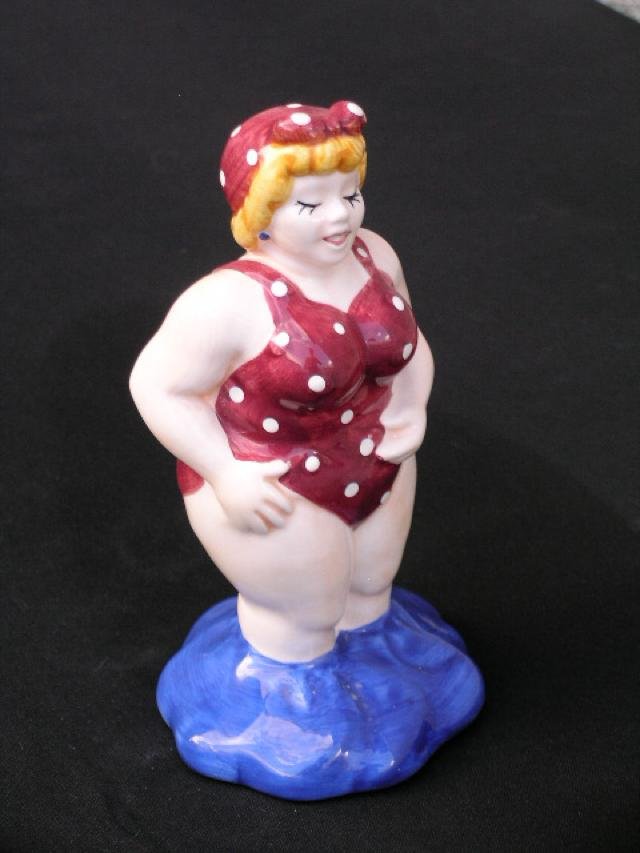 Lekka ceramiczna i zabawnie fantastyczna ozdoba łazienkowa - z serii rozkosznych pływaków w dawnych strojach kąpielowych :) Na pewno przyciągnie spojrzenia w łazience :) Na błyszcząco szkliwiona, ręcznie malowana. 8,5 x 7,5 x 16 cm. Stan zachowania bardzo dobry.
