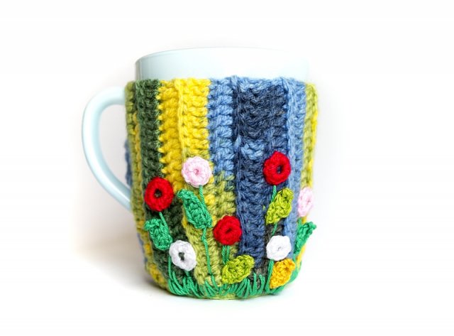 Ocieplacz na kubek, ręcznie wykonany na szydełku z włóczki.