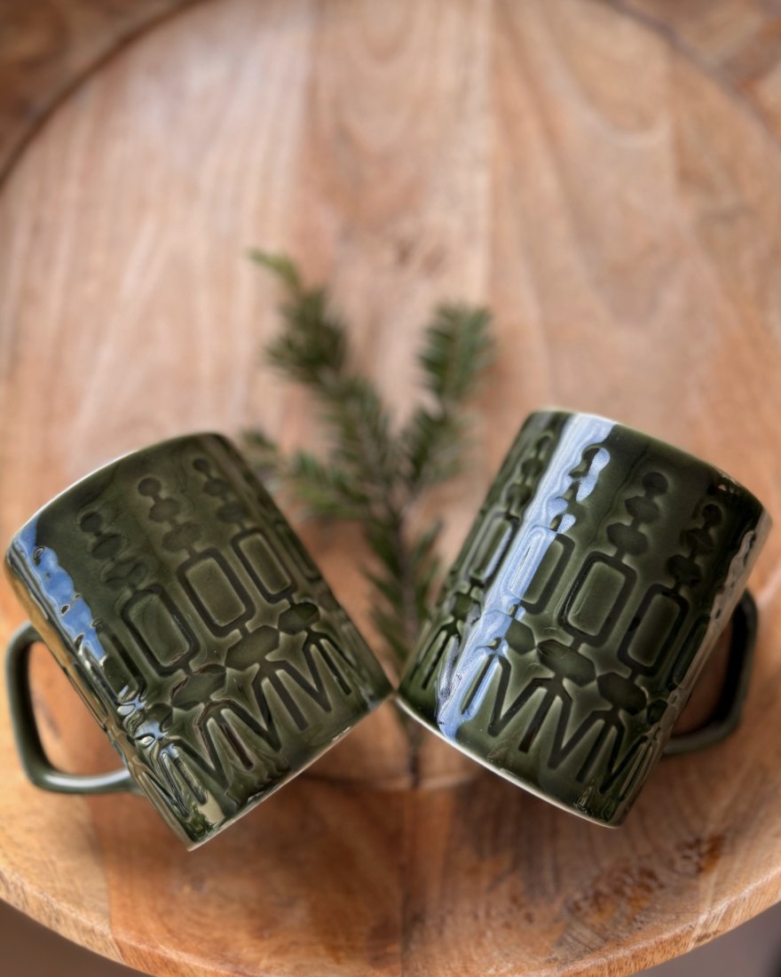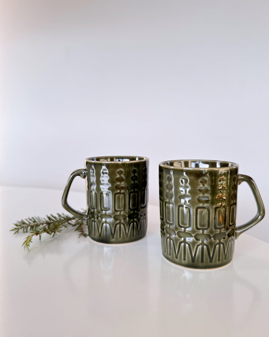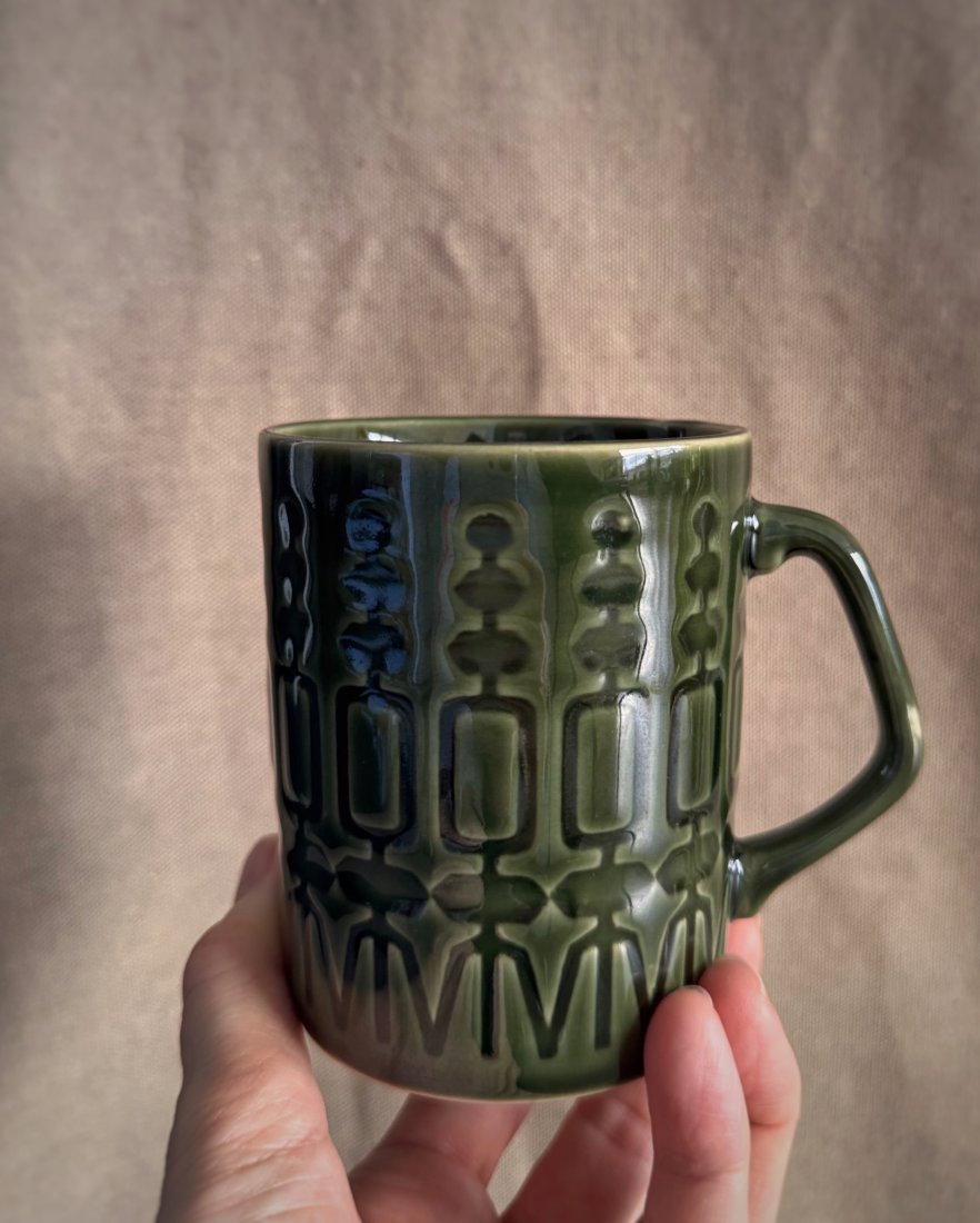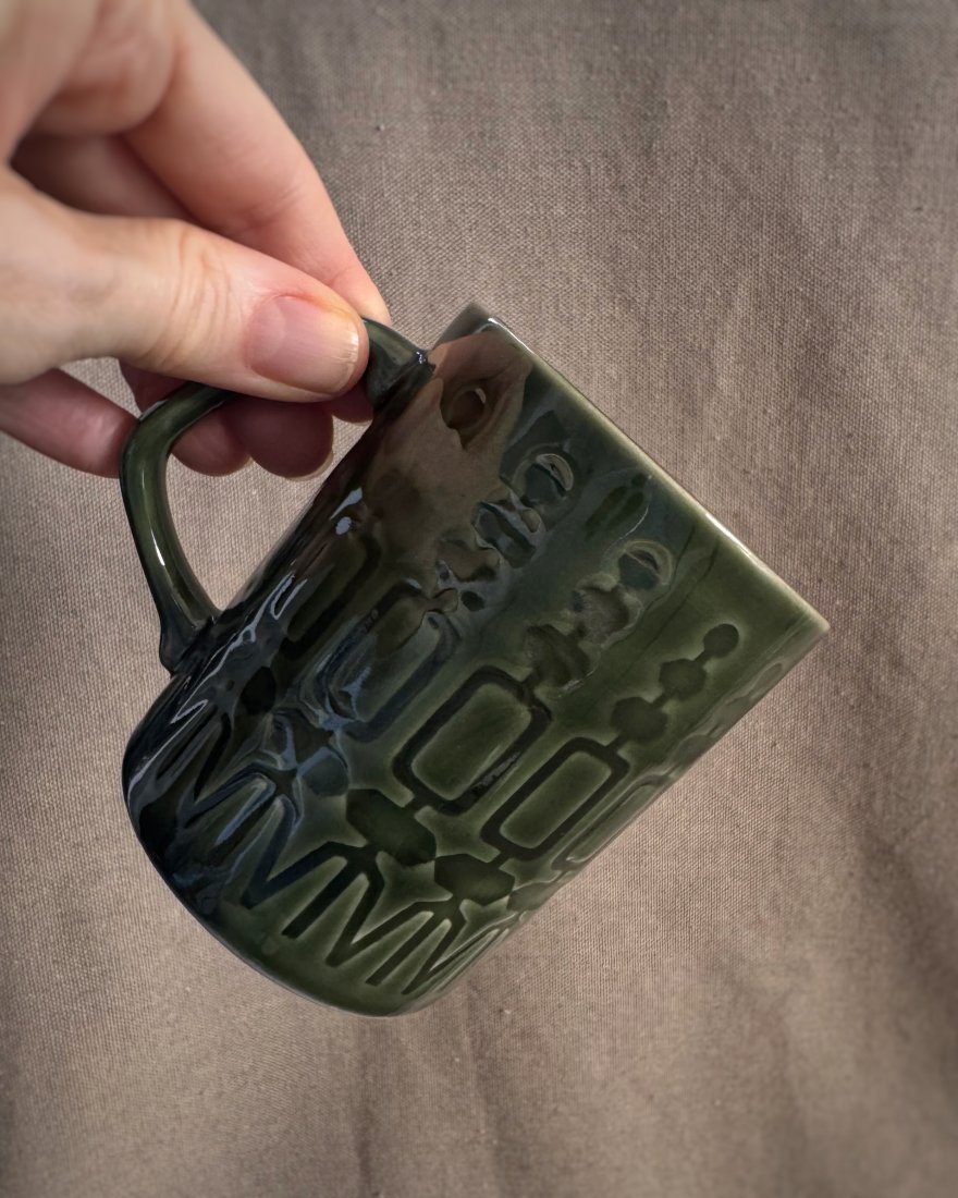 Kubek porcelitowy zdobiony wzorem zwanym przez kolekcjonerów Aztek, w rzadkim zielonym kolorze. Produkowany w II połowie XX w.
