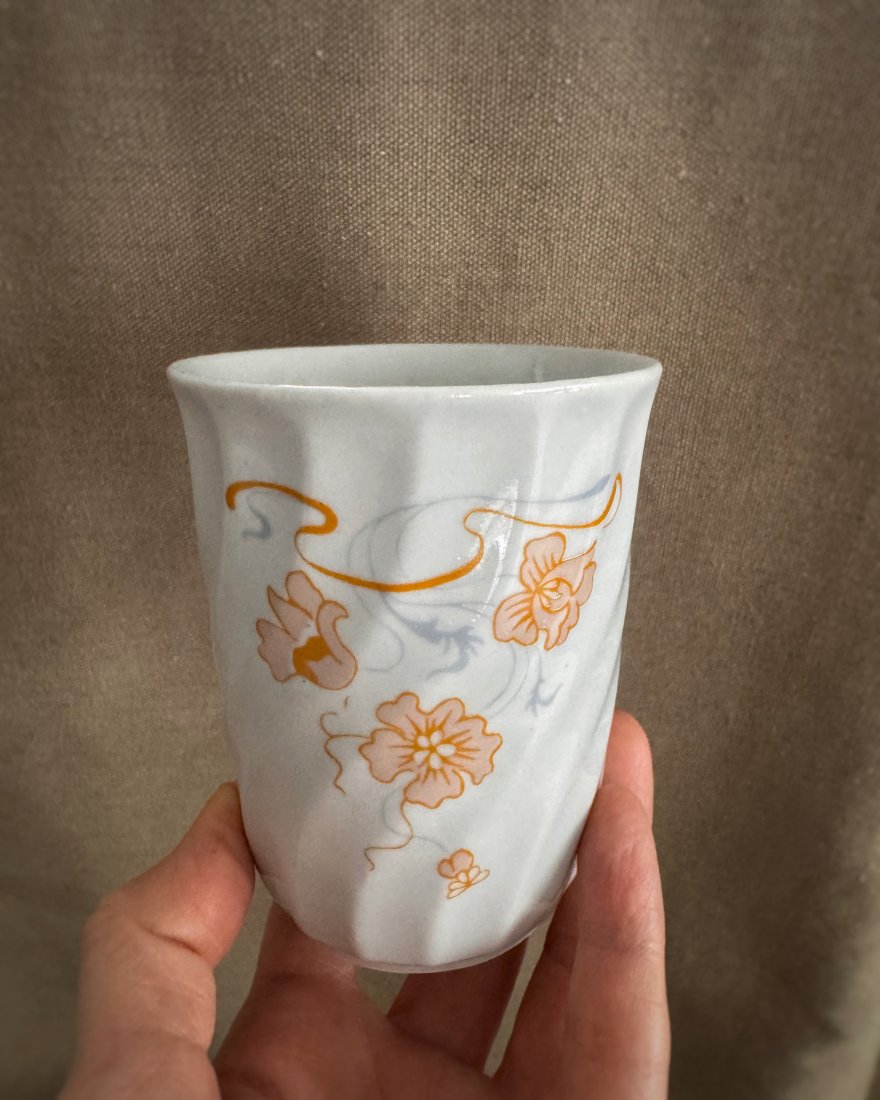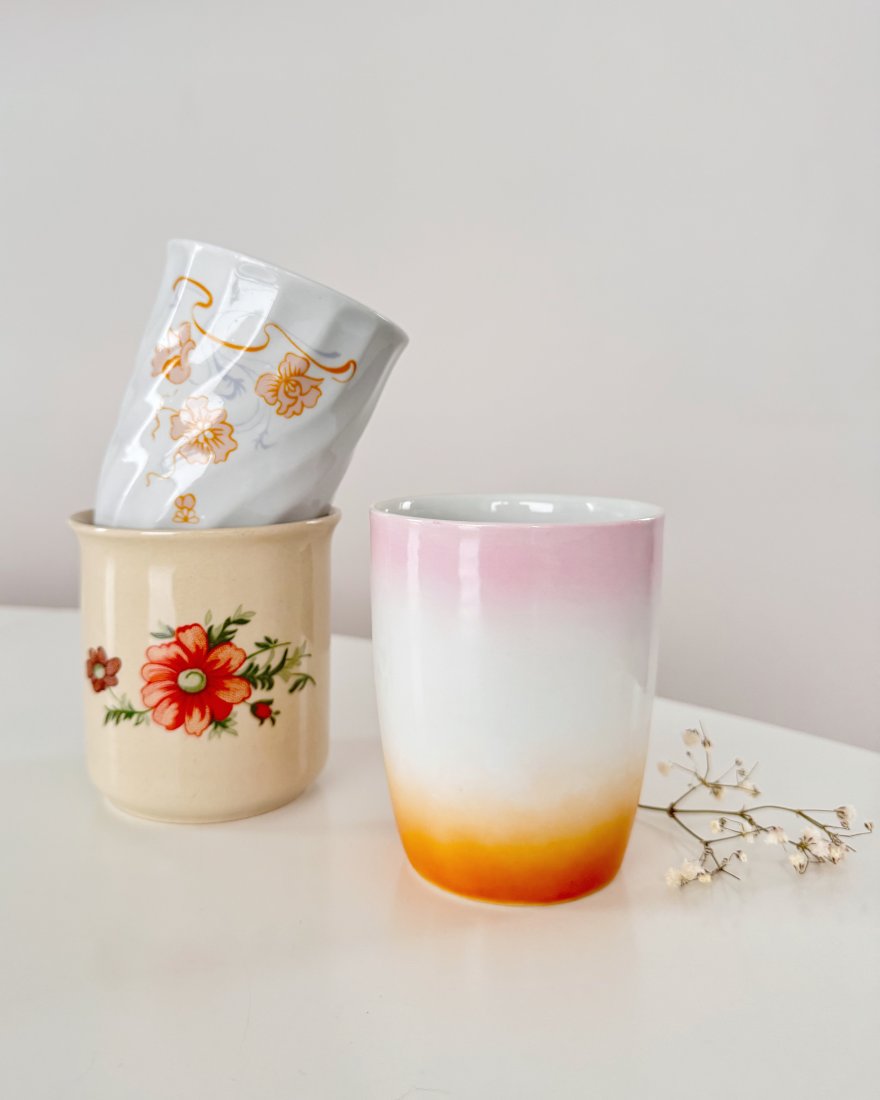Kubek biały w prążki, wykonany z porcelany, zdobiony dwustronnie kolorową kalkomanią w kwiaty.