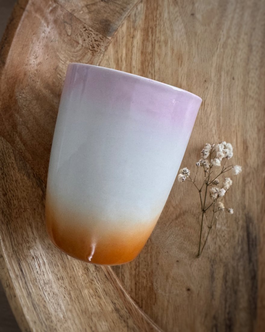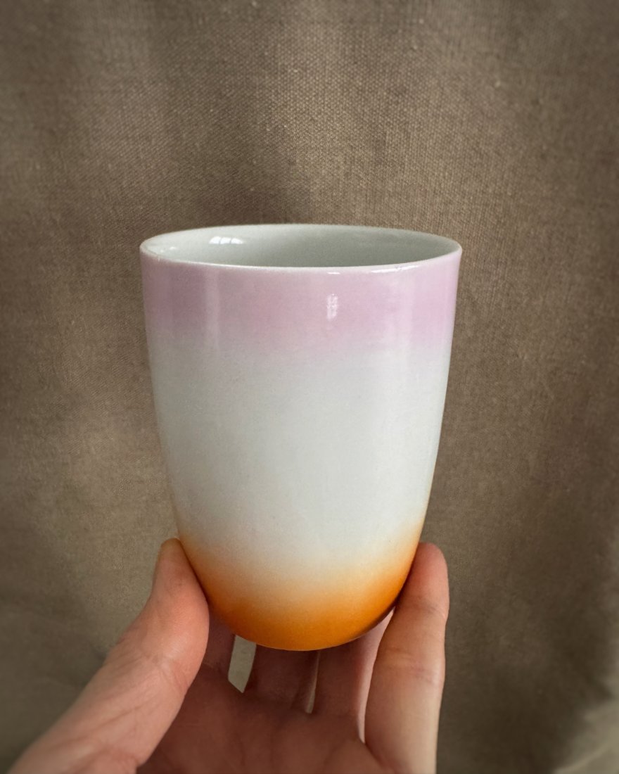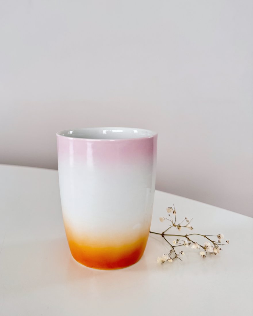 Kubek tęczowy, wykonany z porcelany, zdobiony natryskowo.