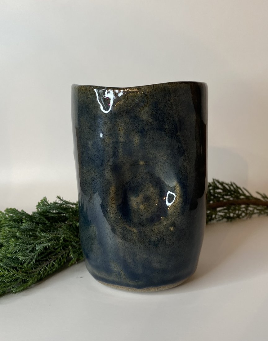 Ten ręcznie wykonany kubek zachwyca naturalną formą oraz wyjątkowym szkliwem w odcieniach głębokiego granatu z subtelnymi, złotawymi przebarwieniami. Delikatnie nieregularny kształt i miękkie wgłębienia nadają mu autentyczny, rzemieślniczy charakter, sprawiając, że każdy egzemplarz jest jedyny w swoim rodzaju.