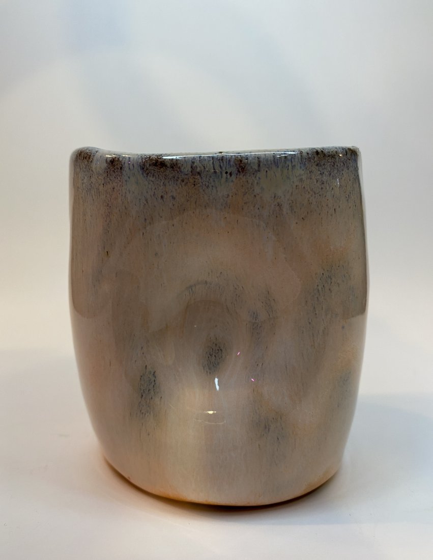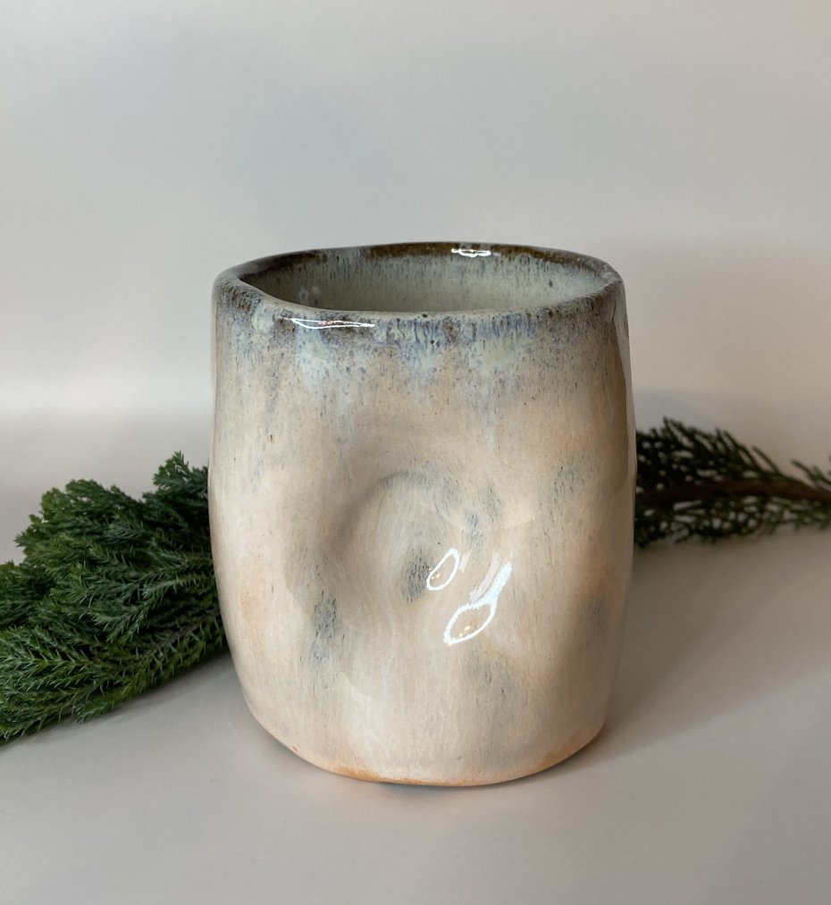 Ten wyjątkowy kubek został uformowany i szkliwiony ręcznie, dzięki czemu każdy egzemplarz ma niepowtarzalny charakter. Delikatna paleta barw — od jasnych, kremowo-piaskowych tonów po subtelne szare i lekko niebieskawe przejścia — tworzy efekt spokojnej, naturalnej tekstury.
