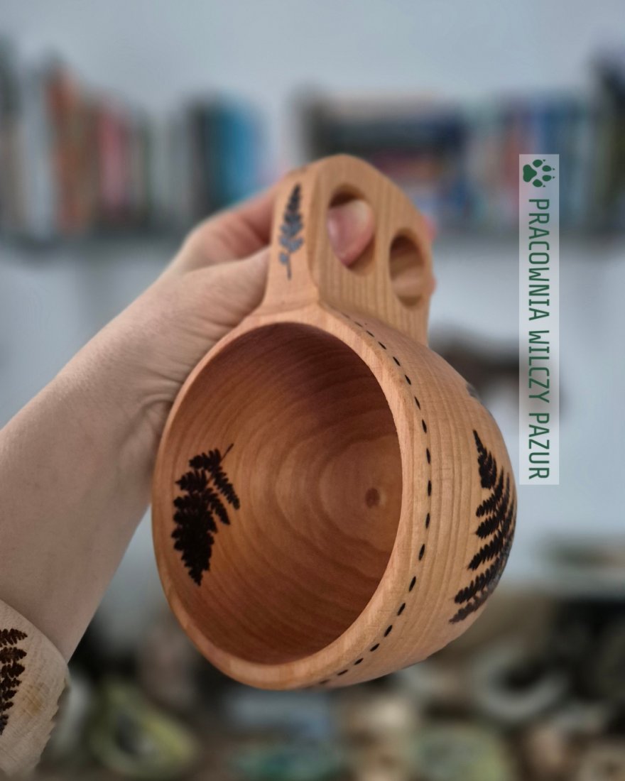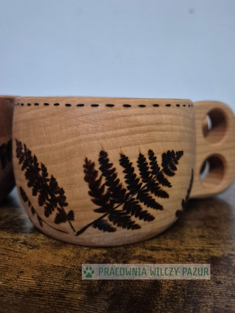 Ten drewniany kubek został ozdobiony wypalonym motywem paproci i zaimpregnowany olejem parafinowym, dzięki czemu można się z niego napić kawy, czy herbaty. Kawa z takiego naczynia będzie na pewno smakować inaczej, niż ze zwyklej filiżanki, szczególnie, jesli bedzie pita na przykład na górskim szlaku . Kubek z powodzeniem też posłuży jako, na przykład , pojemnik na orzeszki, albo po prostu ciekawa, naturalna ozdoba wnętrza.