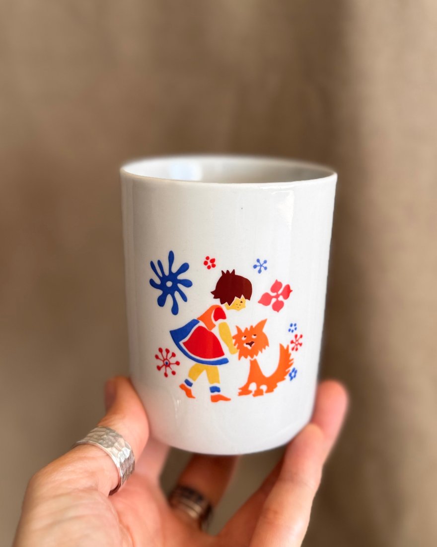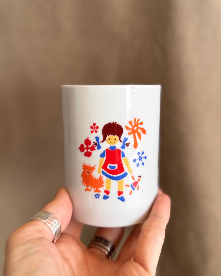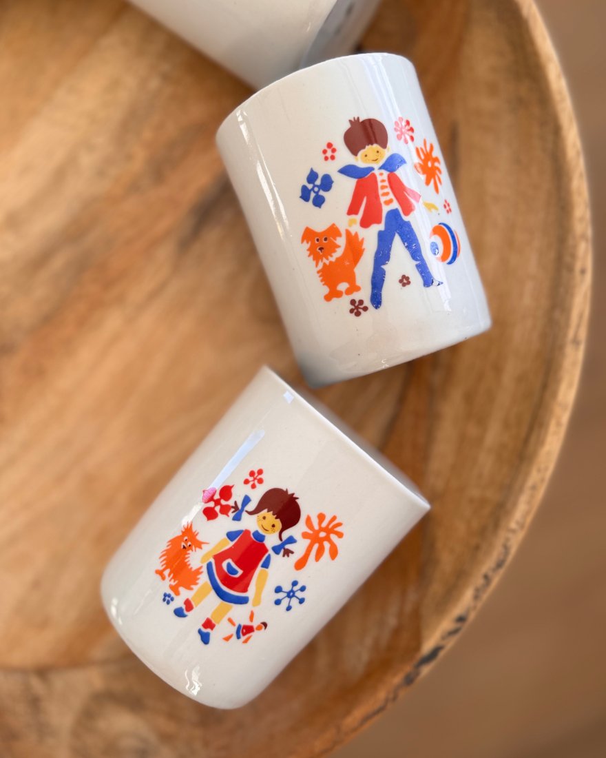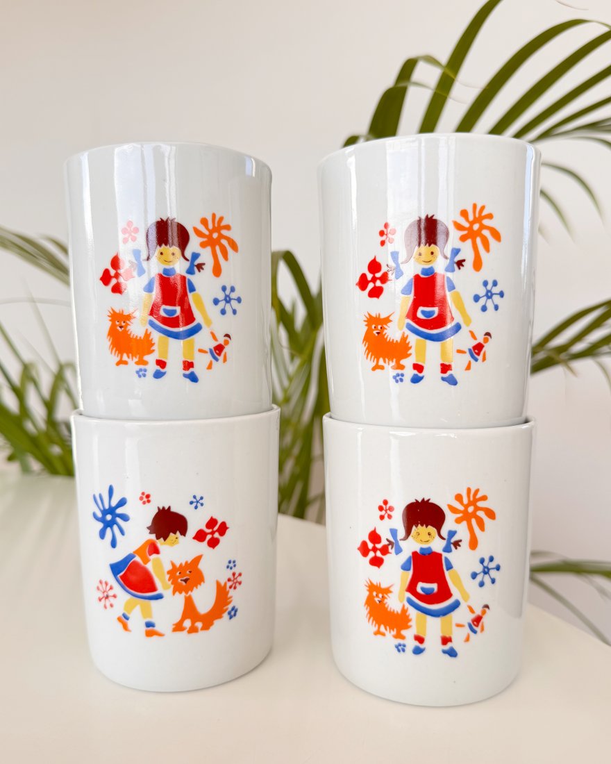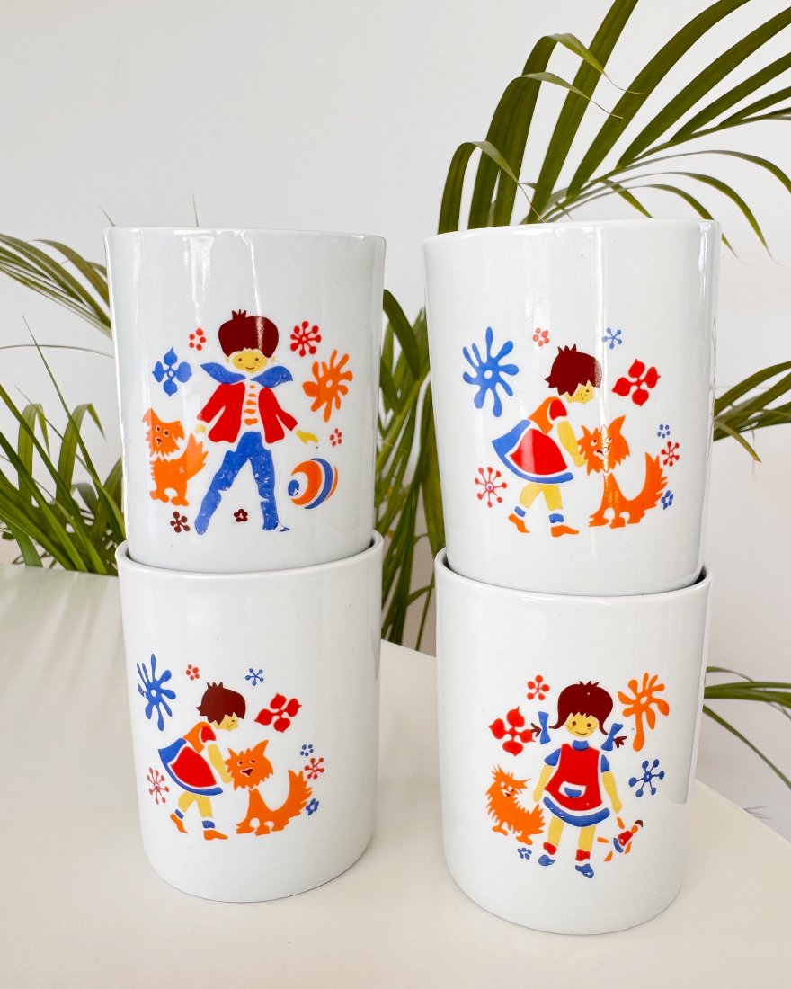 Kubki barowe z porcelany zdobione dwustronnie dziecięcymi wzorami.