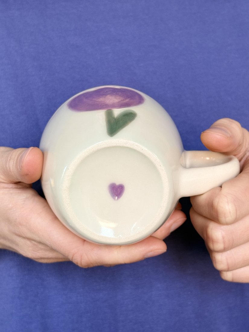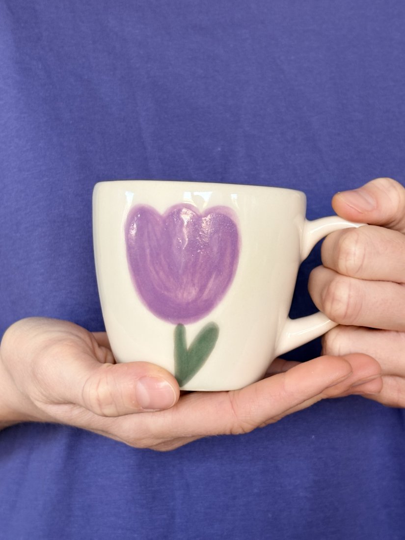Kubek z fioletowym tulipanem został pomalowany i poszkliwiony ręcznie. Wypalony w piecu dwukrotnie, najpierw na biskwit, następnie na ostro. Użyte farby oraz szkliwo posiadają certyfikat do kontaktu z żywnością. Można myć w zmywarce. Pojemność kubka to 220 ml.