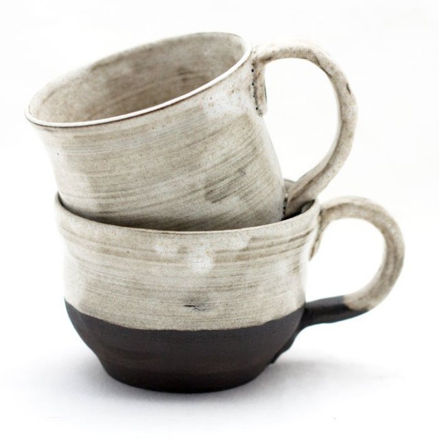 Komplet złożony z kubka i filiżanki, toczonych na kole garncarskim.